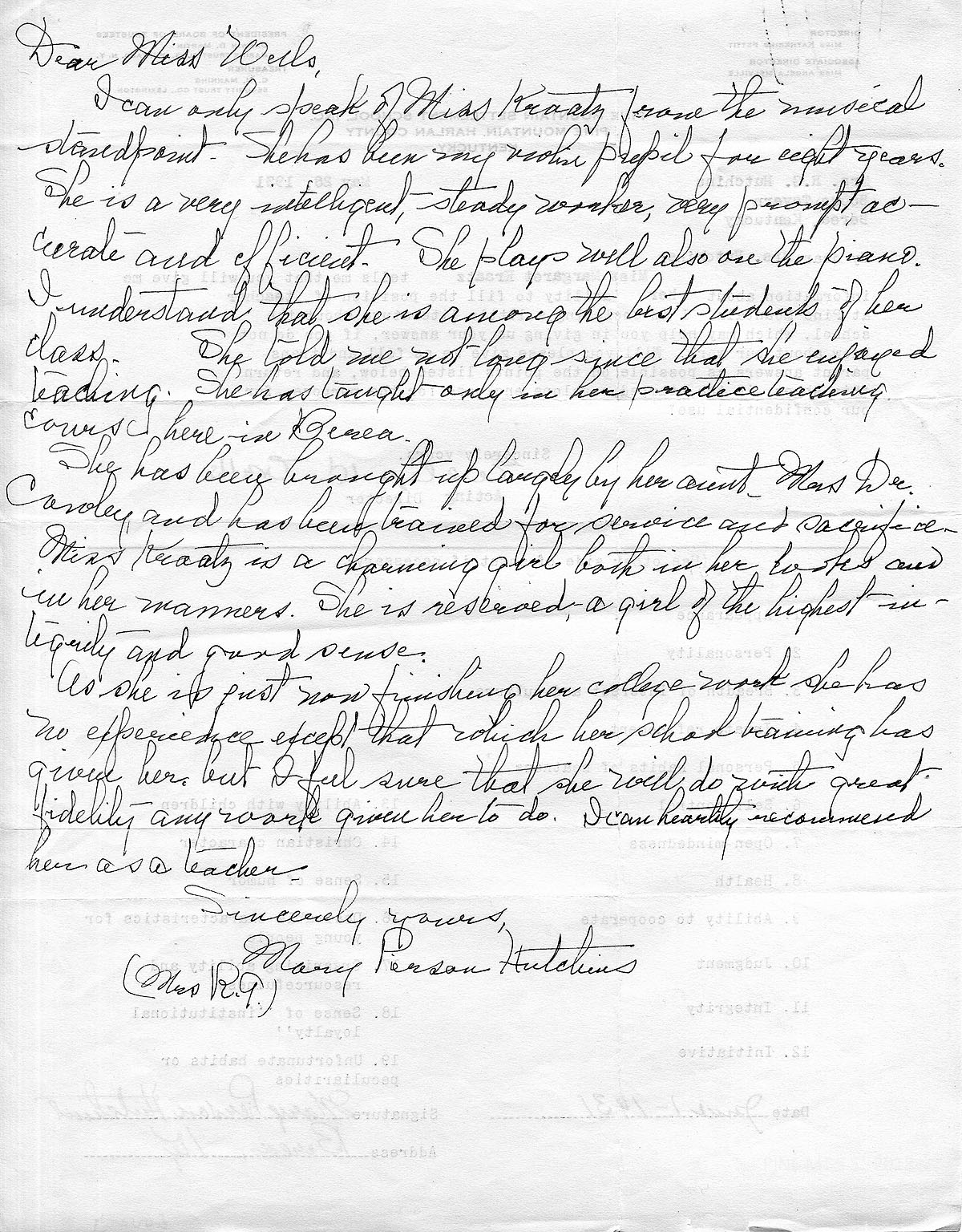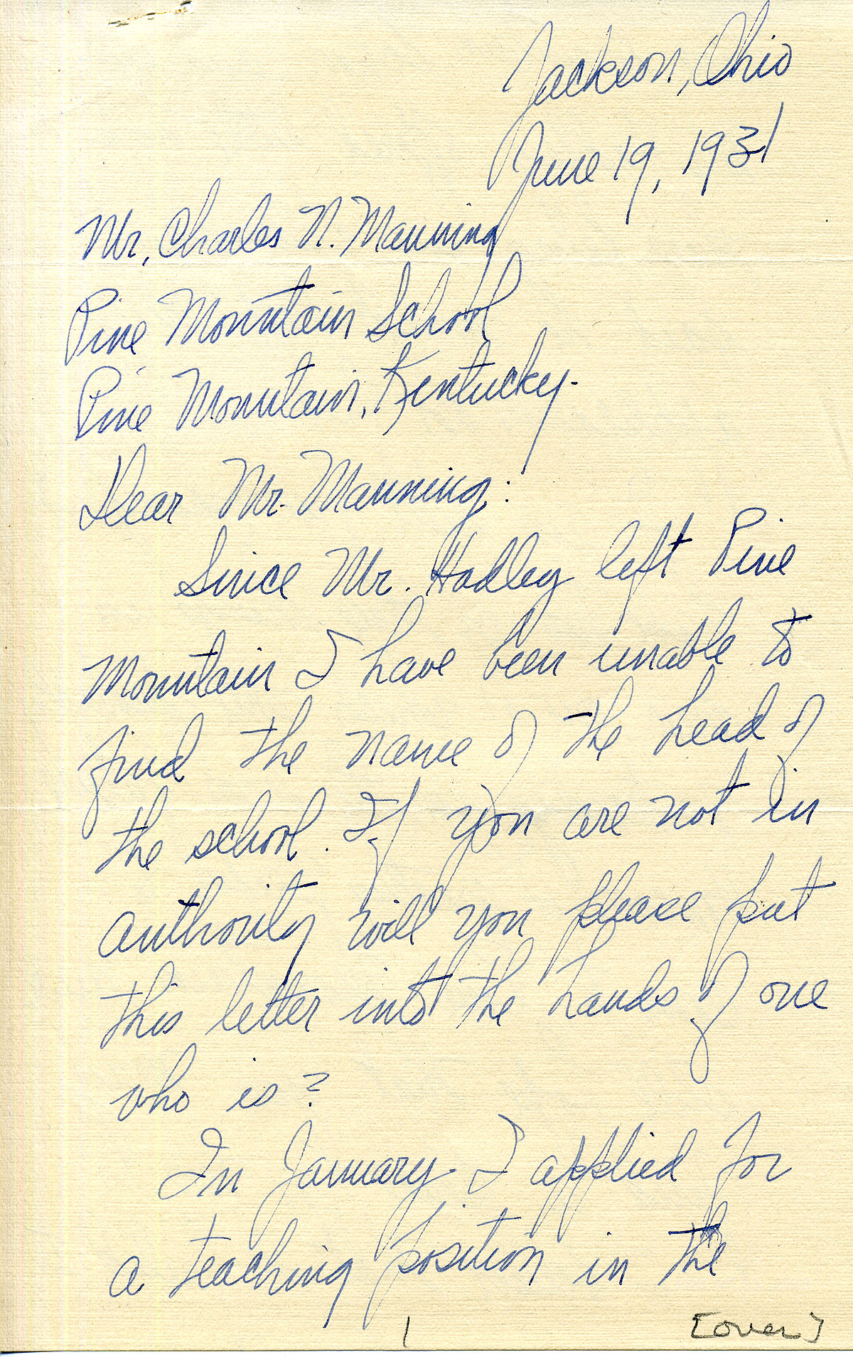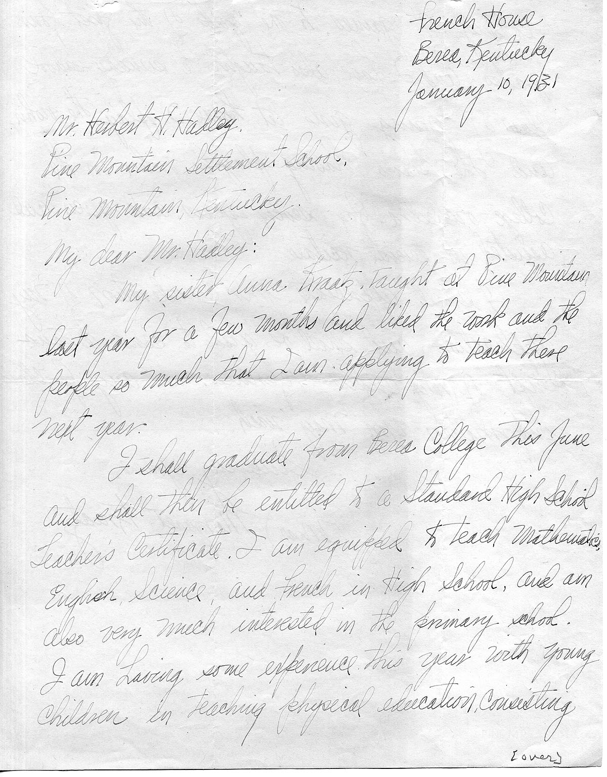 9/3/31 Letter to Theodore Wright from Sherill Flanary at Berea. She is asking him to help her find a job for the next year.