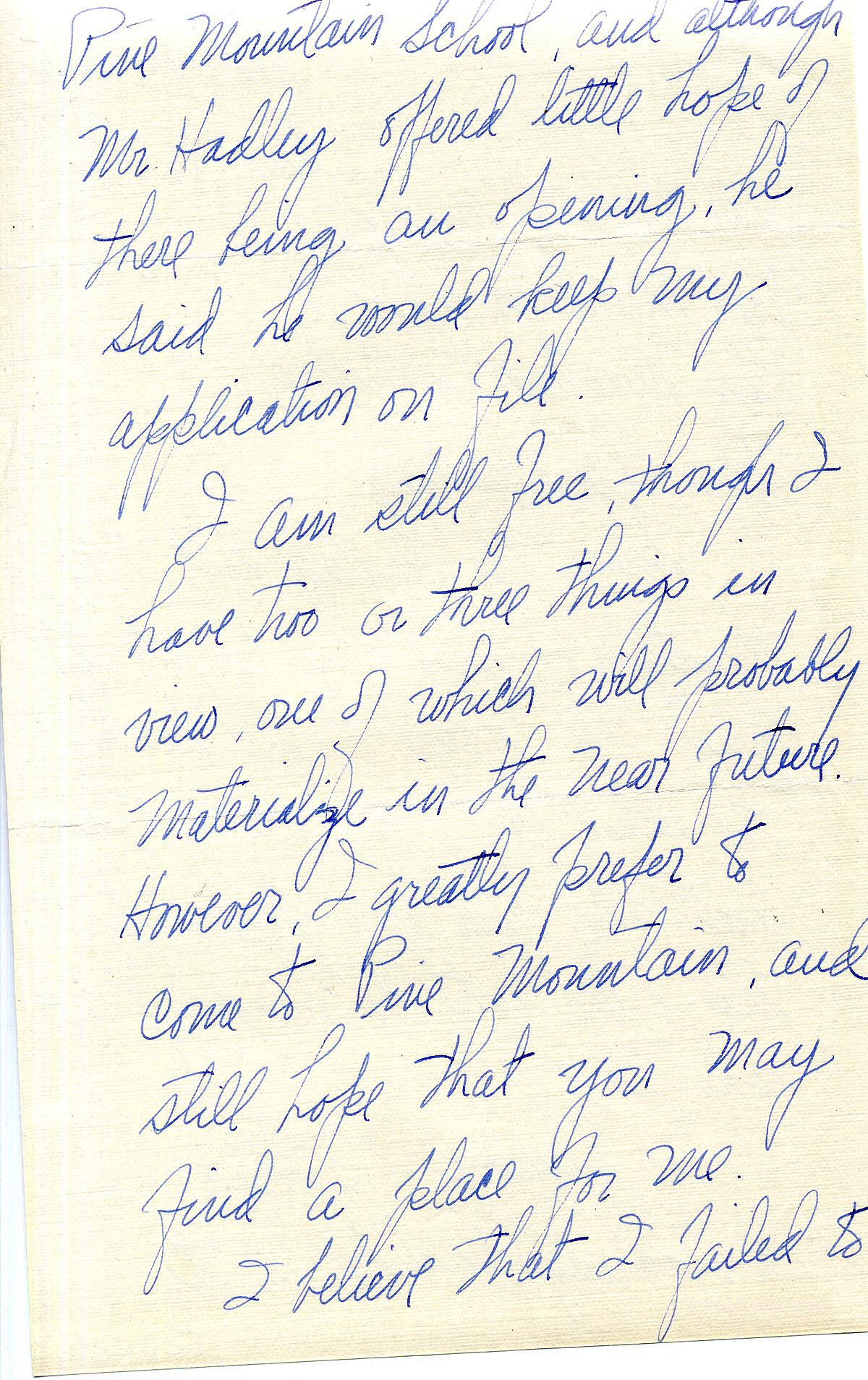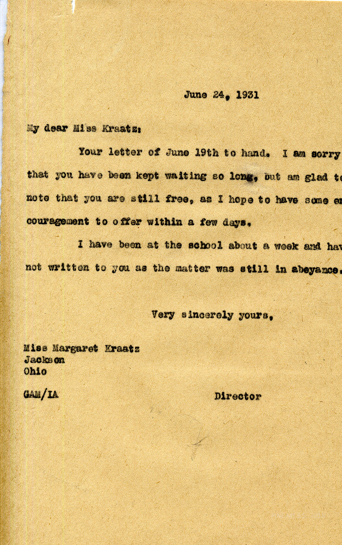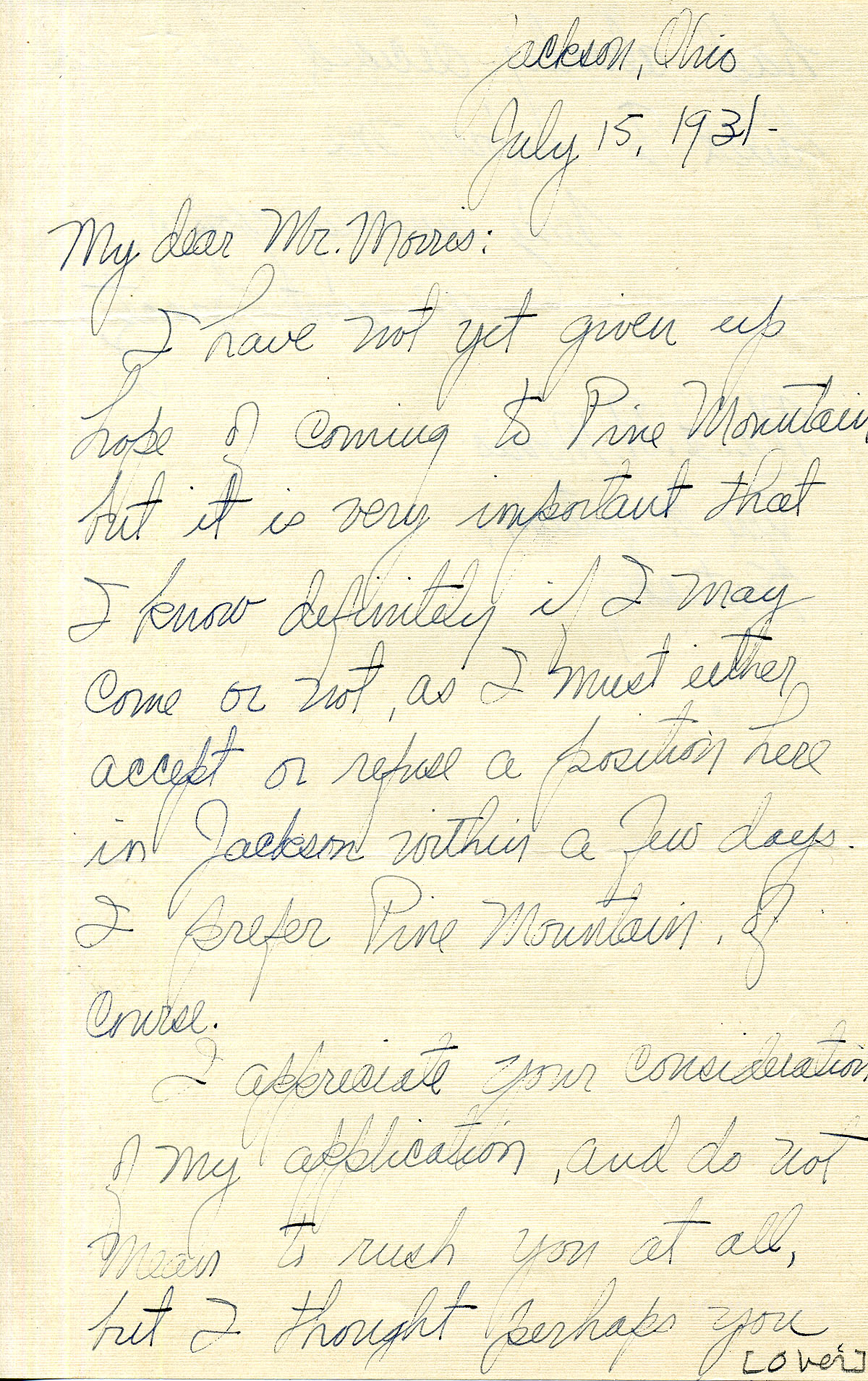 7/20/31 Margaret writes there is nothing to write about but manages a long letter. She says if she does not get the job at Pine Mt. her mother will expect her to stay home.