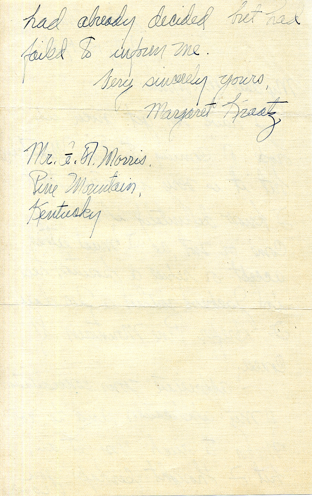 - Correspondence 1931 October Margaret writes from Pine Mountain to Theodore in Bellevue Ky. Margaret continues her courting letters teasing him about other women and telling of the men she knows. Always she loves him. Coffee consumption and weight come up frequently in the letters.