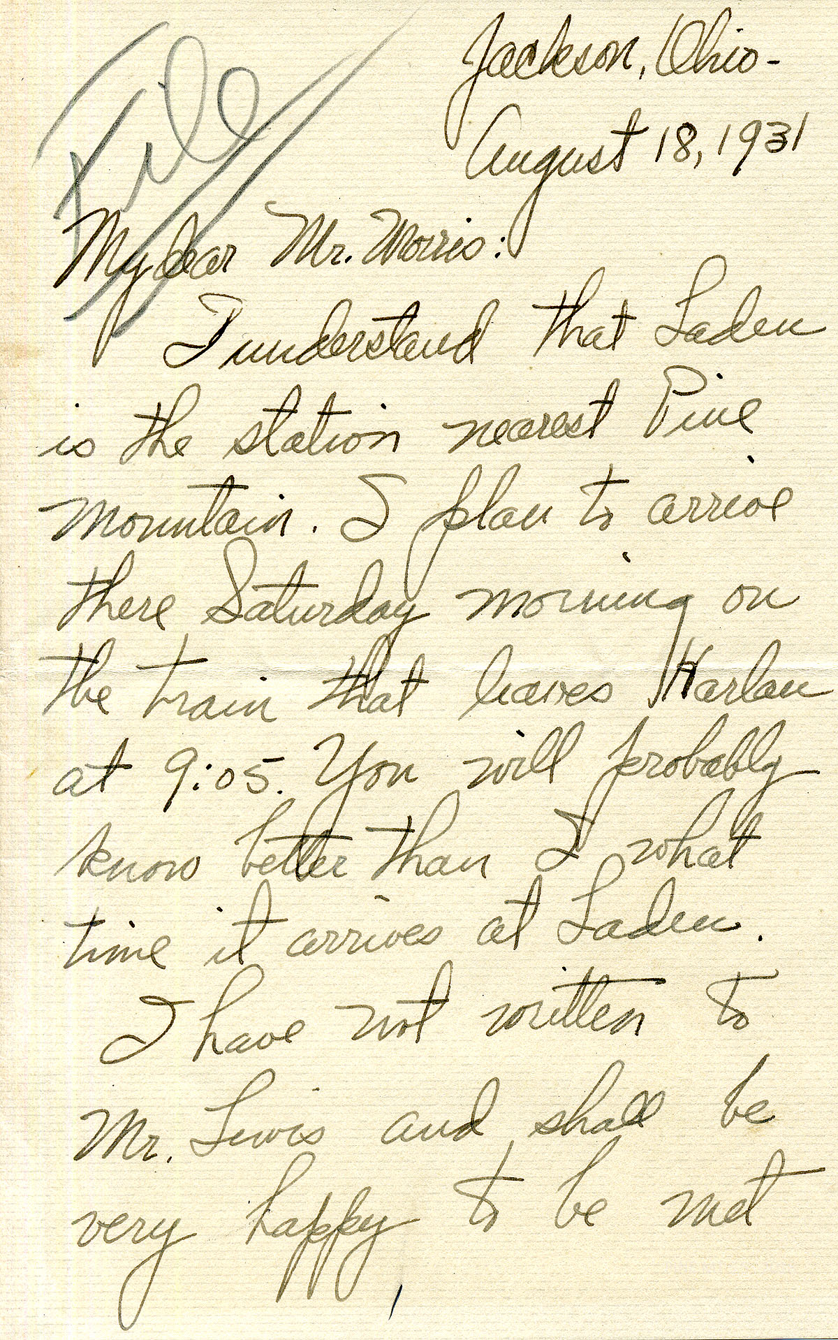 7/17/31 Jackson, Ohio. She compliments him on his sermon. She talks about applying to Pine Mountain and jumping off a bridge if she doesn’t get the job.