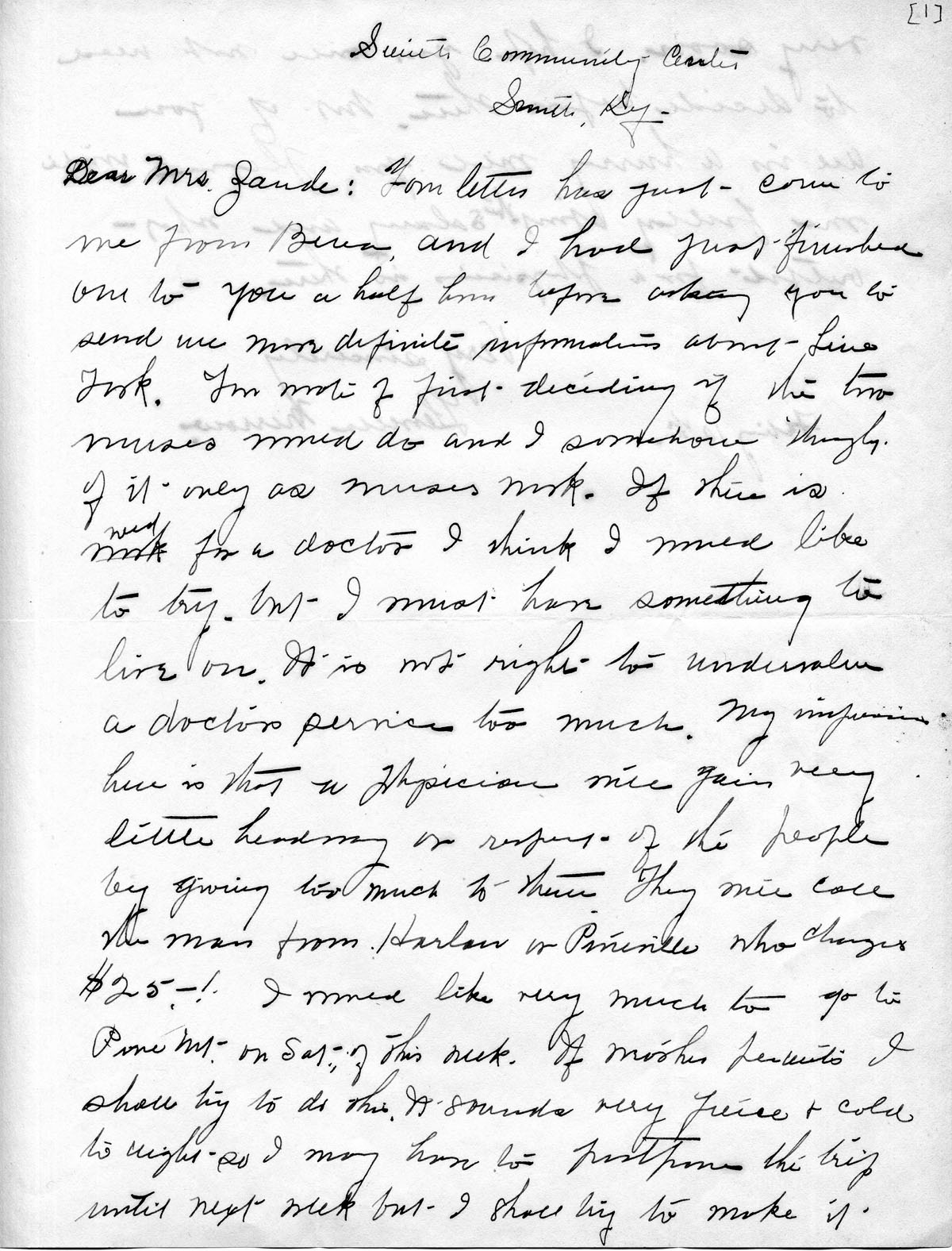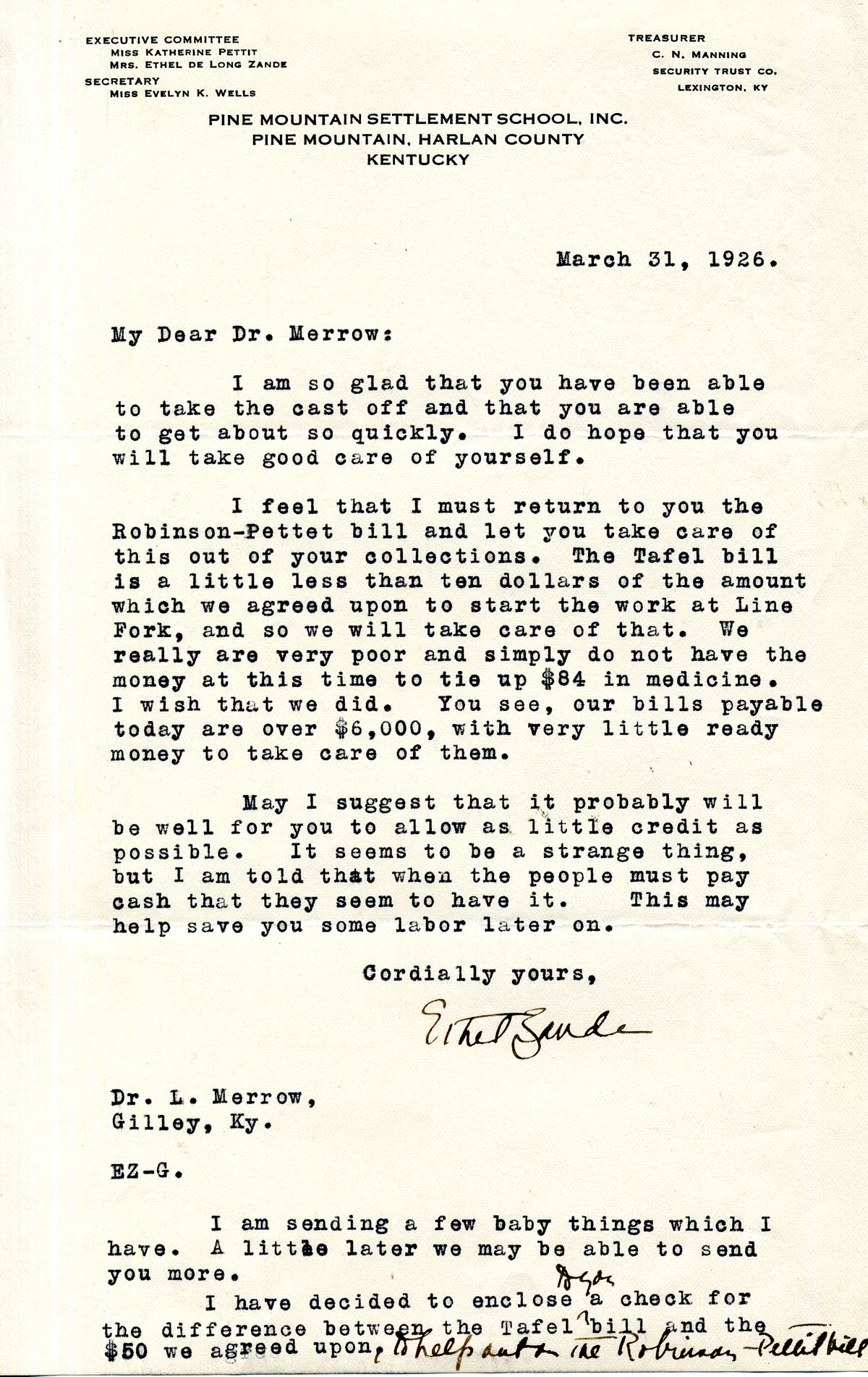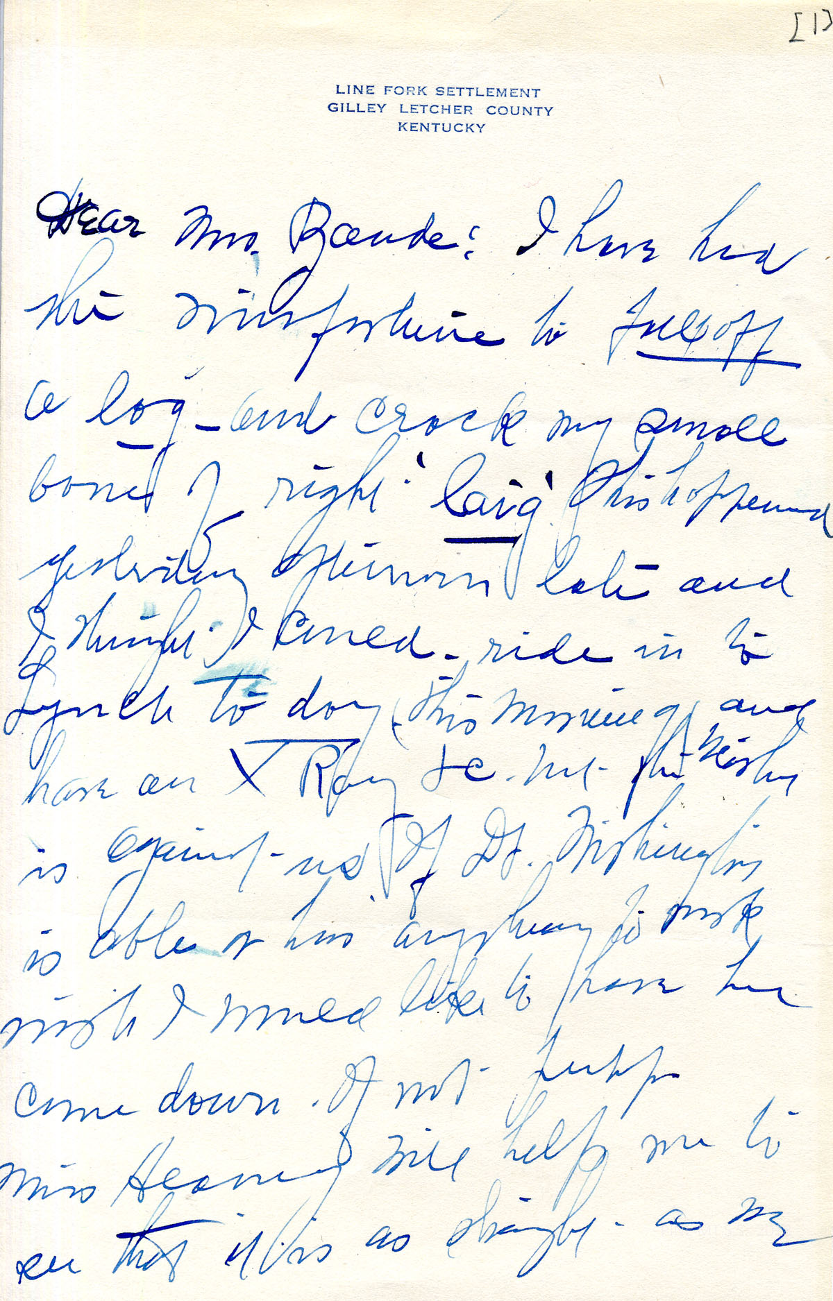 Dear Mrs. Zande: Your letter has just come to me from Berea and I have just finished one to you a half hour before asking you to send me more definite information about Line Fork. You write of first deciding if the two nurses would do and I somehow thought of it only as nurses work. If there is need for a doctor I think I would like to try but I must have something to live on. It is not right to undervalue a doctor’s service too much. My opinion here is that a Thespian[?] will gain very little hearing or respect of the people by giving too much to them. They will call the man from Harlan or Pineville who charges $25 –! I would like very much to go to Pine Mt. on Sat of this week. If weather permits I shall try to do this. It sounds very …?… and cold tonight so I may have to postpone the trip until next week but I shall try to make it very soon. I hope you will not need to decide before then, but if you are in a hurry will you please write me fully about[?] salary and why outfit?… for a physician is there.
