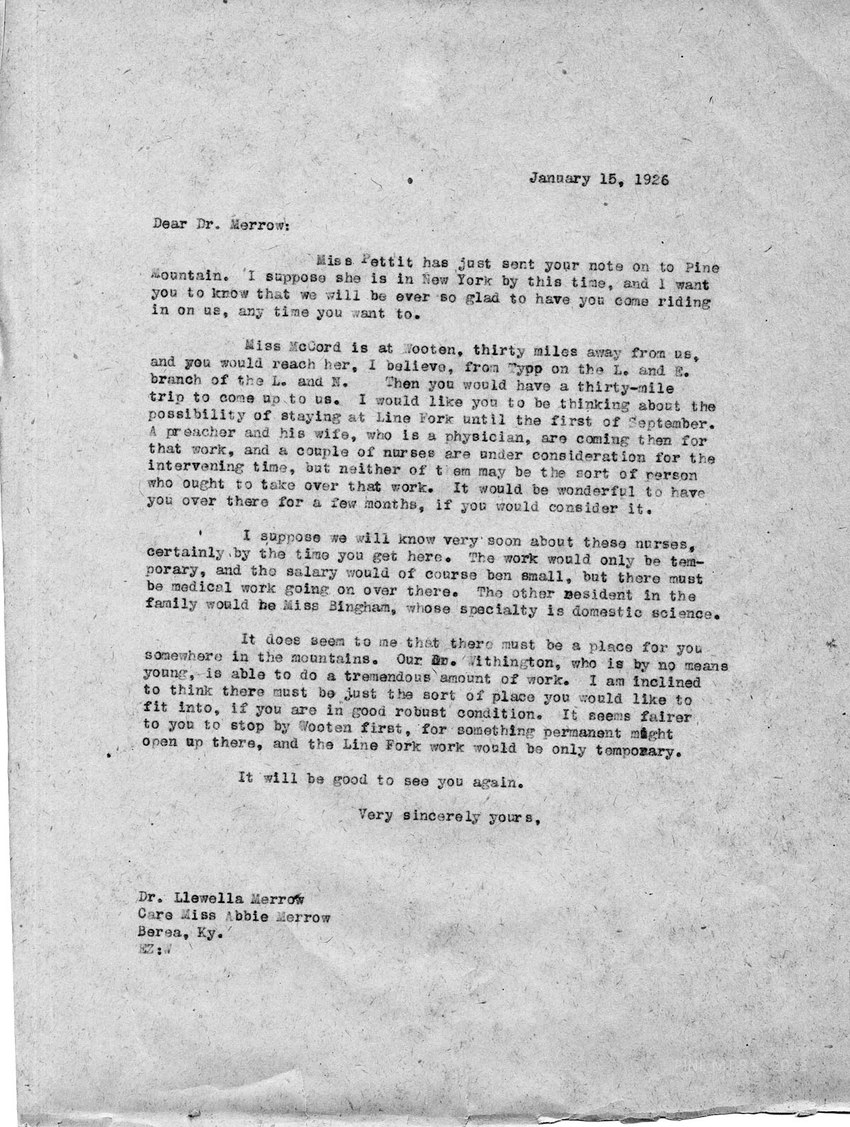 It does seem to me that there must be a place for you somewhere in the mountains. Our Dr. [Alfreda] Withington, who is by no means young, is able to do a tremendous amount of work. I am inclined to think there must be just the sort of place you would like to fit into if you are in good robust condition. It seems fairer to you to stop by Wooton first, for something permanent might open up there and the Line Fork work would be only temporary.