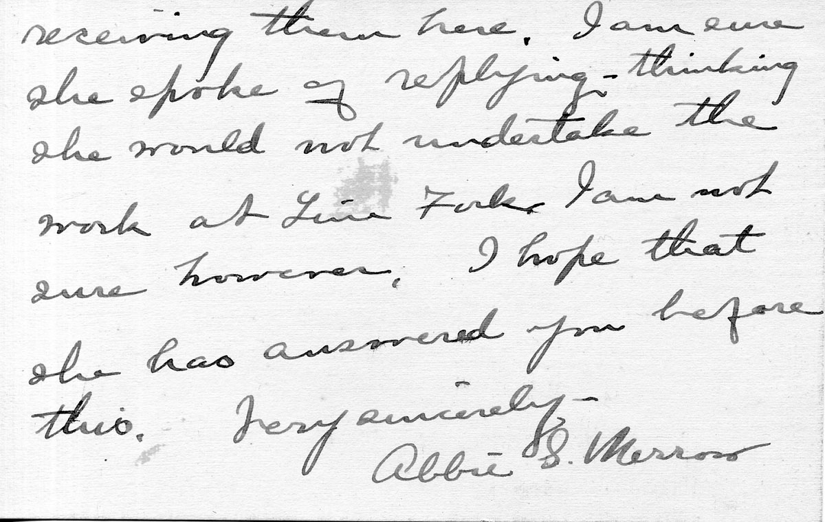 –receiving them here. I am sure she spoke of replying — thinking she would not undertake the work at Line Fork. I am not sure, however. I hope that she has answered you before this.