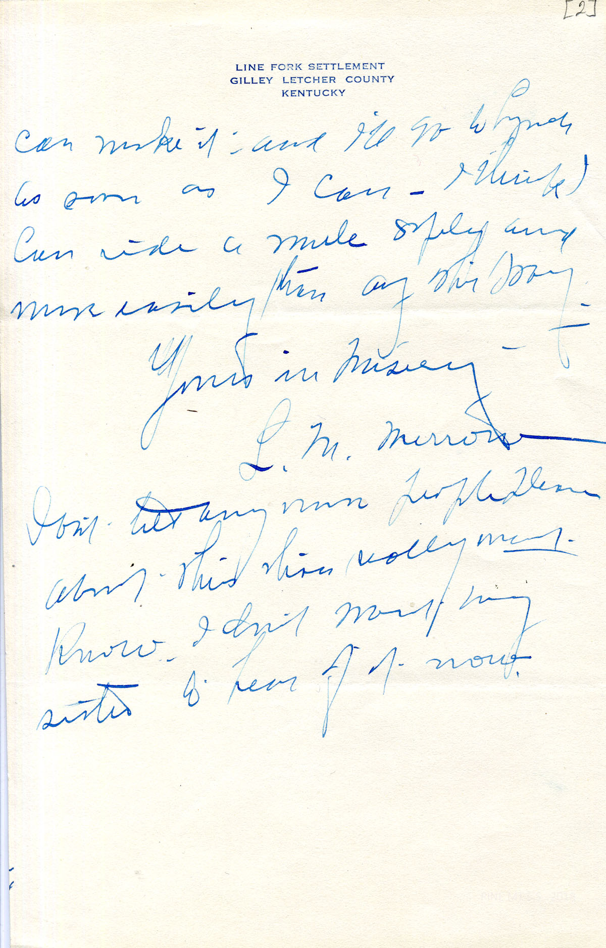 Miss Heeley[?] will bring over a group of children to you some day, and we will try to get the refracting lenses to you, as soon as possible. I hope you won’t have to pay that awful price to get back; I was much upset to think that the Line Fork people did not have a more neighborly spirit. Several people from this side have been carried over the mountain, and nobody has ever had to pay a cent. Indeed, one of our workers, who was accompanied by about thirty men who took turns carrying her, had a dollar given her by one of them, who said he was sure she would need it!