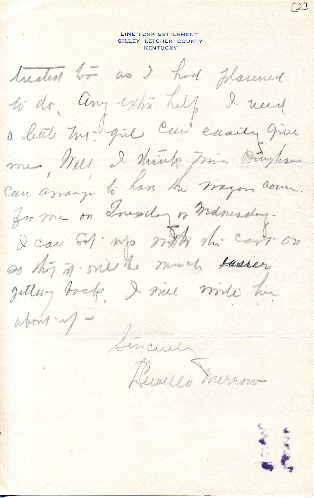 TAGS: Dr. Llewella Merrow Correspondence I; Llewella Merrow; Llewella Maria Merrow; Dr. Merrow; physicians; Pine Mountain Settlement School; Ethel de Long Zande; Line Fork Settlement; medical work; Line Fork Settlement; Gilley, KY; Katherine Pettit; train travel; Dr. Alfreda Withington; eyeglasses; trachoma; medical supplies; horses; Playville; maternity cases; adenoids cases;