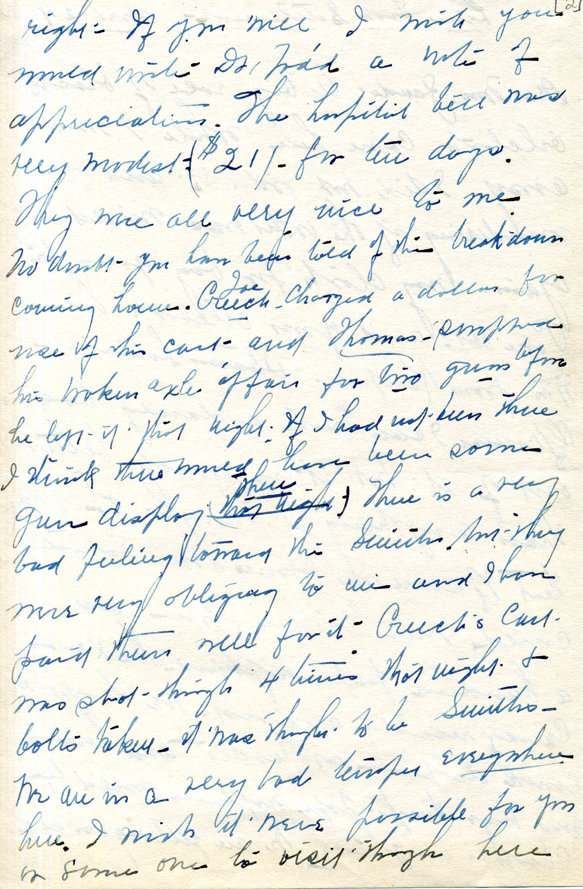 –right. If you will I wish you would write Dr. Todd a note of appreciation. The hospital bill was very modest: ($21) – for ten days. They were all very nice to me. No doubt you have been told of this breakdown coming home. Joe Creech charged a dollar for use of his cart and Thomas Shephard his broken axle … for two guns before he left it this night: If I had not been there I think there would have been some gun display there. There is a very bad feeling toward the Smiths[?] … very obliging to … and I have paid them well for it. Creech’s cart was shot through 4 times that night & bolts taken. It was thought to be Smiths. We are in a very bad … everywhere here. I wish it were possible for you or some one to visit … here–