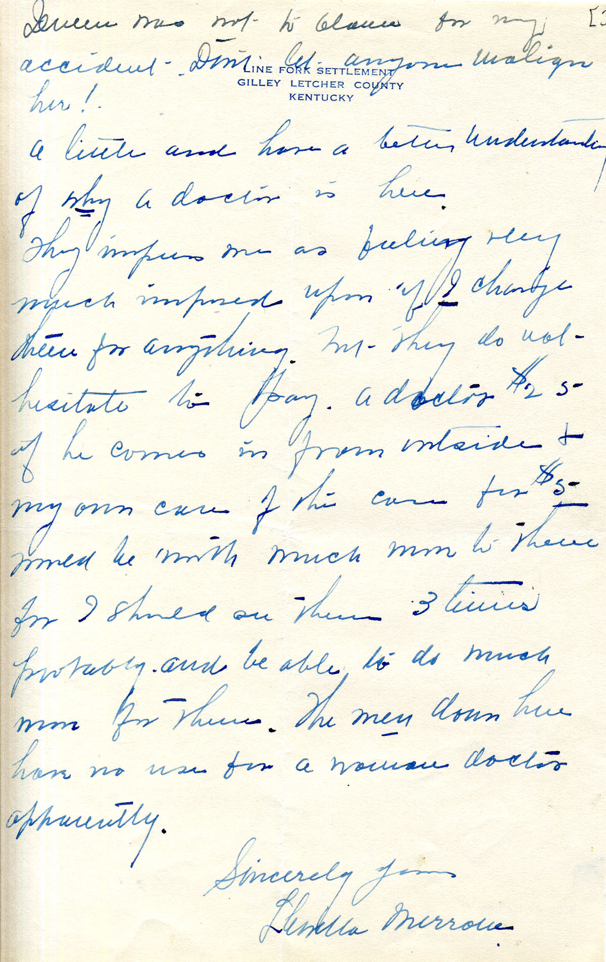 –a little and have a better understanding of why a doctor is here. They impress me as feeling very much imposed upon if I charge them for anything. But they do not hesitate to pay a doctor $25 if he comes in from outside & my own care of this case for $5 would be with much more to … for I should see them 3 times probably and be able to do much more for them. The men down here have no use for a woman doctor apparently.