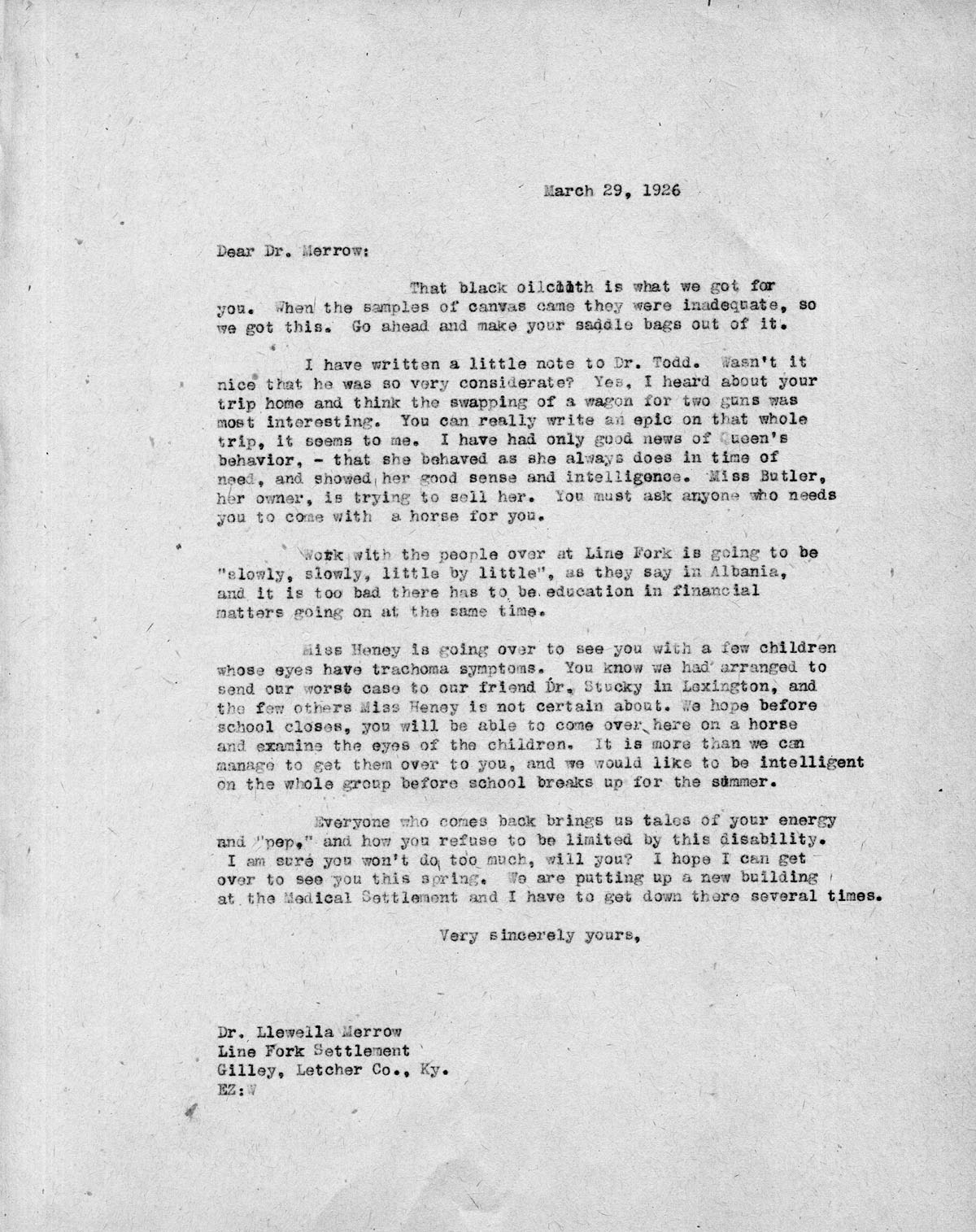 Miss Heney [Heeley?] is going over to see you with a few children whose eyes have trachoma symptoms. You know we had arranged to send our worst cases to our friend Dr. Stucky in Lexington and the few others Miss Heney is not certain about. We hope before school closes, you will be able to come over here on a horse and examine the eyes of the children. It is more than we can manage to get them over to you, and we would like to be intelligent on the whole group before school breaks up for the summer.