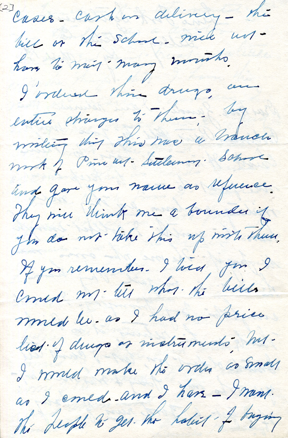 I ordered those drugs, an entire … charges to them by …this was a … work of Pine Mt. Settlement School and gave your name as reference. They will think me a bounder if you do not take this up with them.