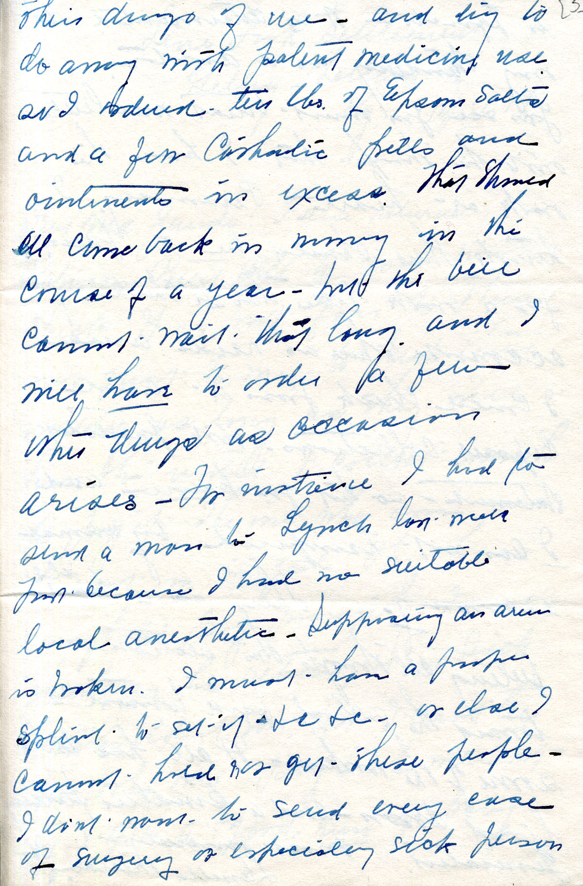 –their drugs of me — and try to do away with patent medicine use so I ordered ten lbs. Of Epsom Salts and a few cathartic[?] pills and ointments in excess. That should all come back in money[?] in the course of a year — but the bill cannot wait that long and I will have to order a few … drugs as occasion arises. For instance I had to send a man to Lynch …because I had no suitable local anesthetic. Supposing an arm is broken. I must have a proper splint to set it & … or else I cannot hold … these people. I don’t want to send every case of surgery or especially sick person–