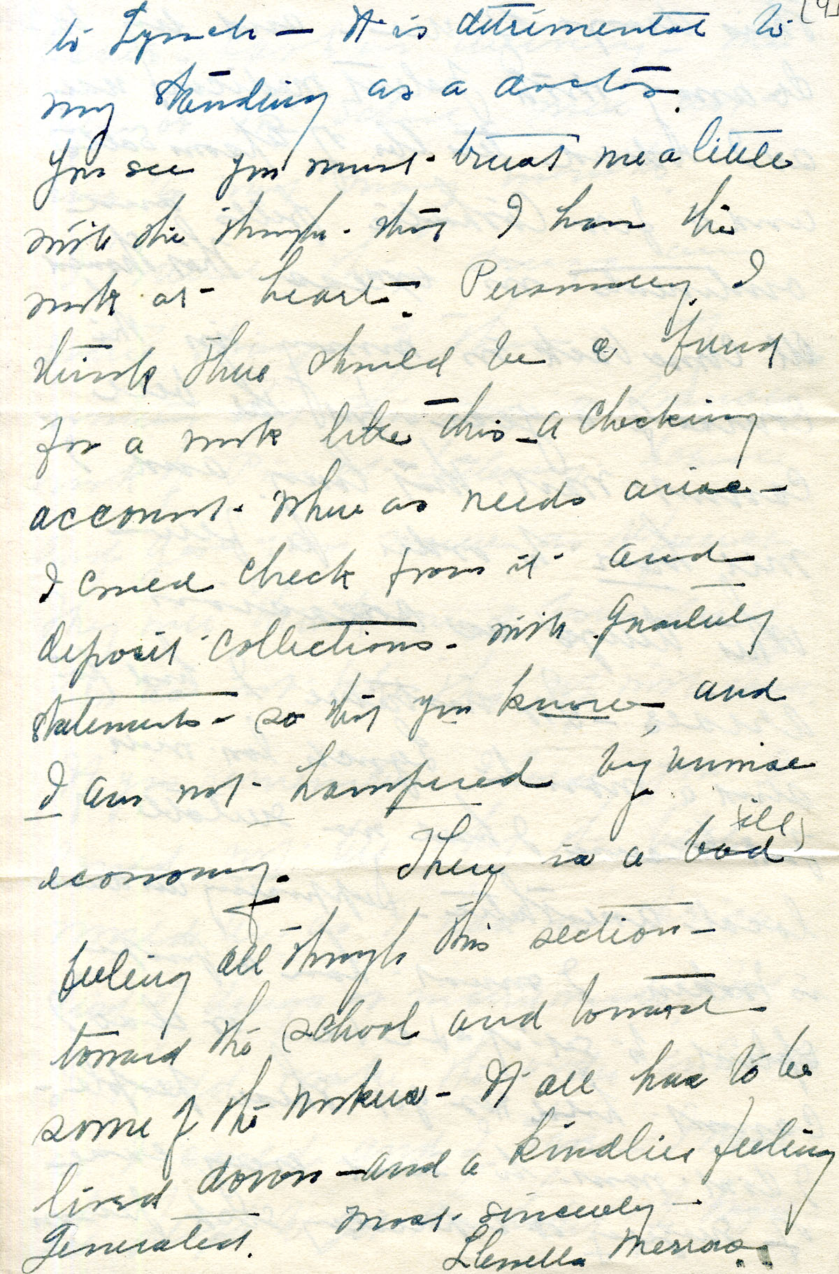 You see … most treat me a little … I have this work at heart. Personally, I think there should be a fund for a work like this. A checking account where as needs arise I could check from it and deposit collections — with gratuity[?] statements so … you know and I am not hampered by unwise economy. There is a bad feeling all through this section — toward the school and toward some of the workers. I…all has to be lived down — and a kindlier feeling generated.