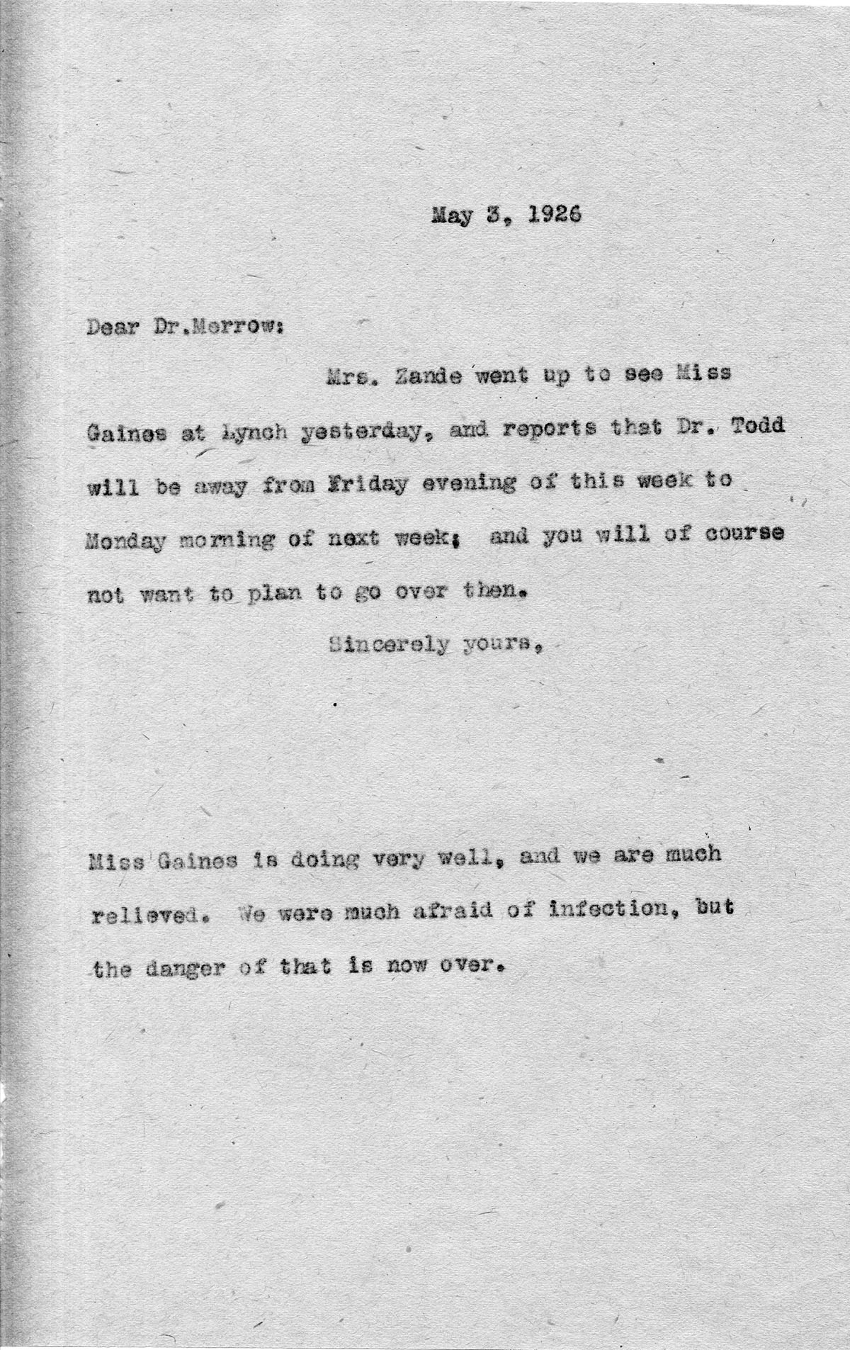 Mrs. Zande went up to see Miss Gaines at Lynch yesterday, and reports that Dr. Todd will be away from Friday evening of this week to Monday morning of next week, and you will of course not want to plan to go over then.