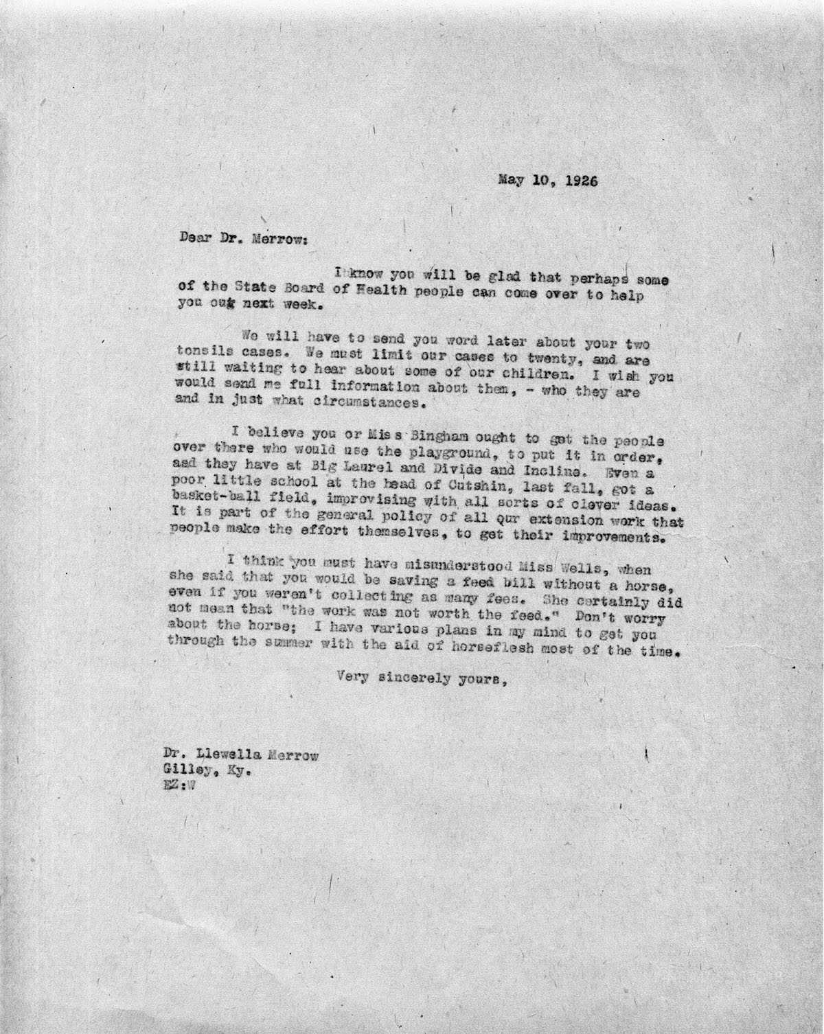 Miss McCord is at Wooton, thirty miles away from us, and you would reach her, I believe, from Typo on the L. and R. branch of the L. and N. Then you would have a thirty-mile trip to come up to us. I would like you to be thinking about the possibility of staying at Line Fork until the first of September. A preacher and his wife, who is a physician, are coming then for that work, and a couple of nurses are under consideration for the intervening time, but neither of them may be the sort of person who ought to take over that work. It would be wonderful to have you over there for a few months if you would consider it.