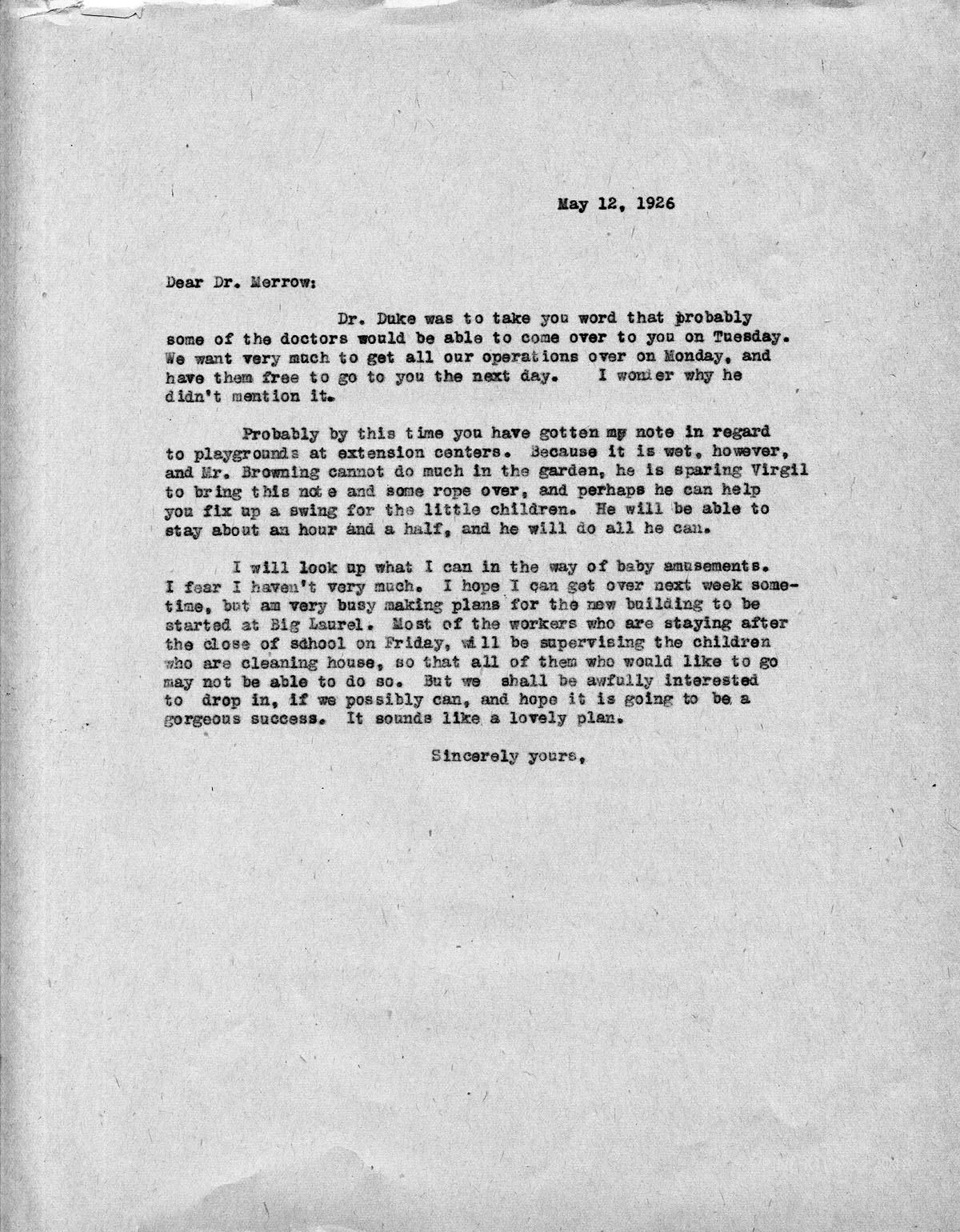 Probably by this time you have gotten my note in regard to playgrounds at extension centers. Because it is wet, however, and Mr. Browning cannot do much in the garđen, he is sparing Virgil [Smith] to bring this note and some rope over, and perhaps he can help you fix up a swing for the little children. He will be able to stay about an hour and a half, and he will do all he can.