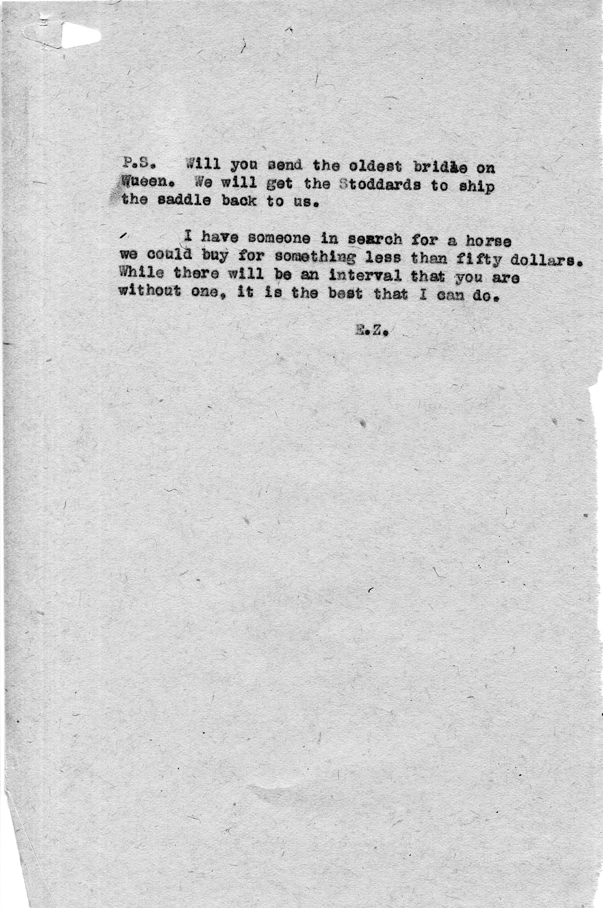 P.S. Will you send the oldest bridle on Queen. We will get the Stoddards to ship the saddle back to us.