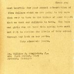 [stapleton_ida_r_1925_066.jpg] May 10, 1928. To Dr. William Stapleton Jr. in Detroit, MI, from [? – likely, Katherine Pettit]. Thanks him for his $5 annual subscription.