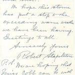 [stapleton_ida_r_1925_110.jpg] May 7, 1936. To “Miss Alice [Cobb]” from Robert Stapleton. Stapleton was invited to a “working” at Bennett Hall’s – “[A] good opportunity of seeing quite a number of folk.” Asked for information about the program on May 15; enjoyed the dogwood breakfast and church service last Saturday.
