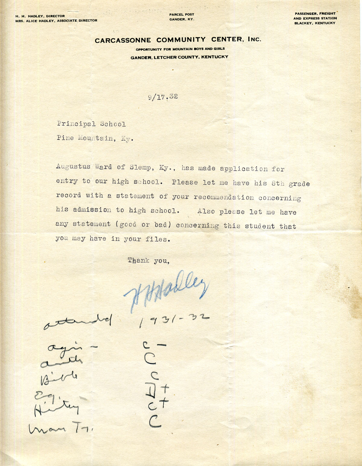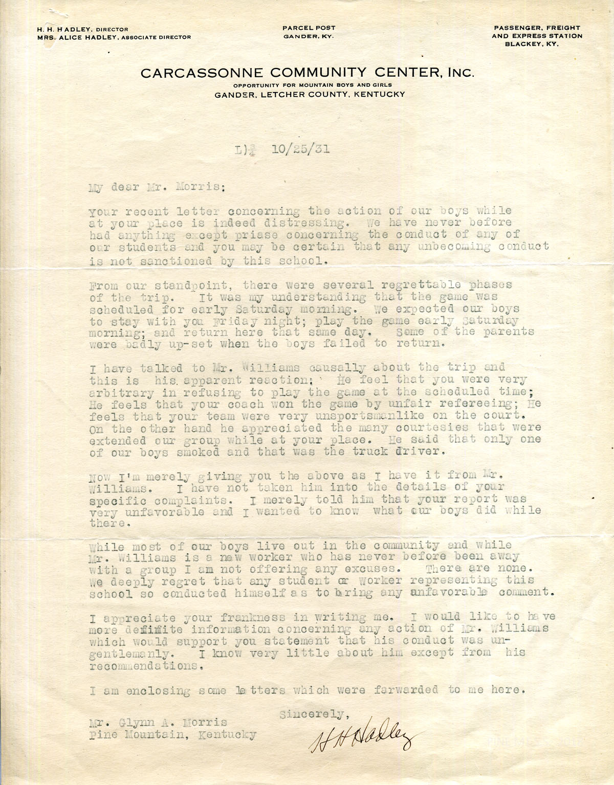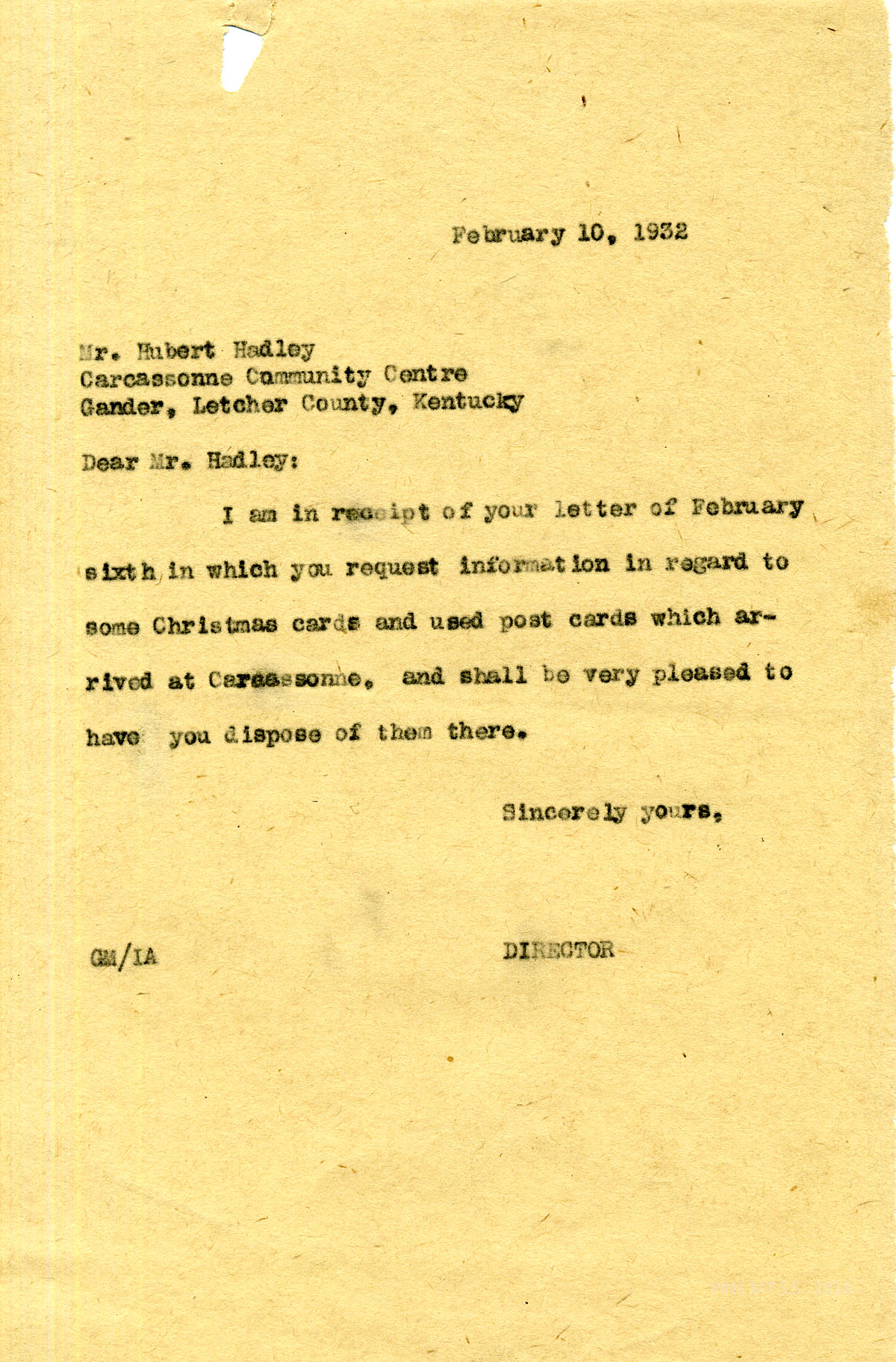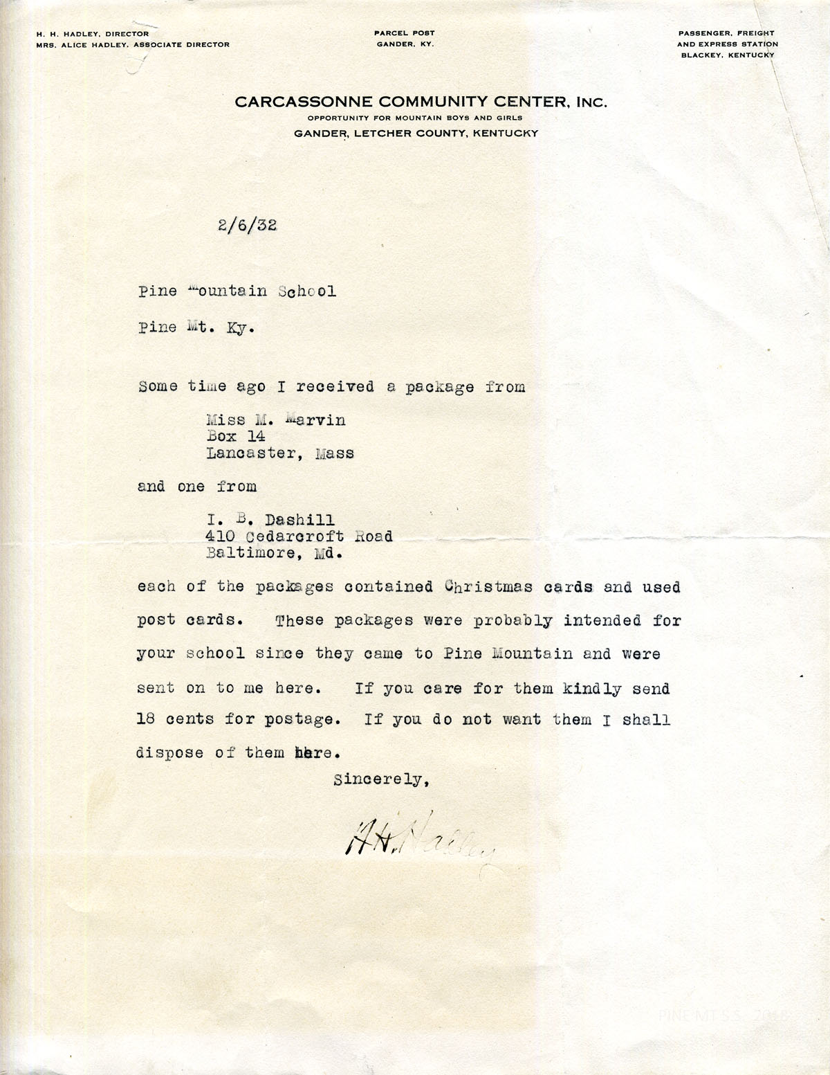 Hubert Hadley Correspondence displays images of letters, dated 1929 to 1939, to and from the Director of Pine Mountain Settlement School who served for one year, 1930-1931. Hubert Hadley’s term was just prior to that of Glyn Morris who succeeded him as PMSS Director and stayed for nearly ten years. Much of the correspondence in his file is with his successor, as he was working not far away at Carcassonne Community Center in Letcher County, Kentucky.