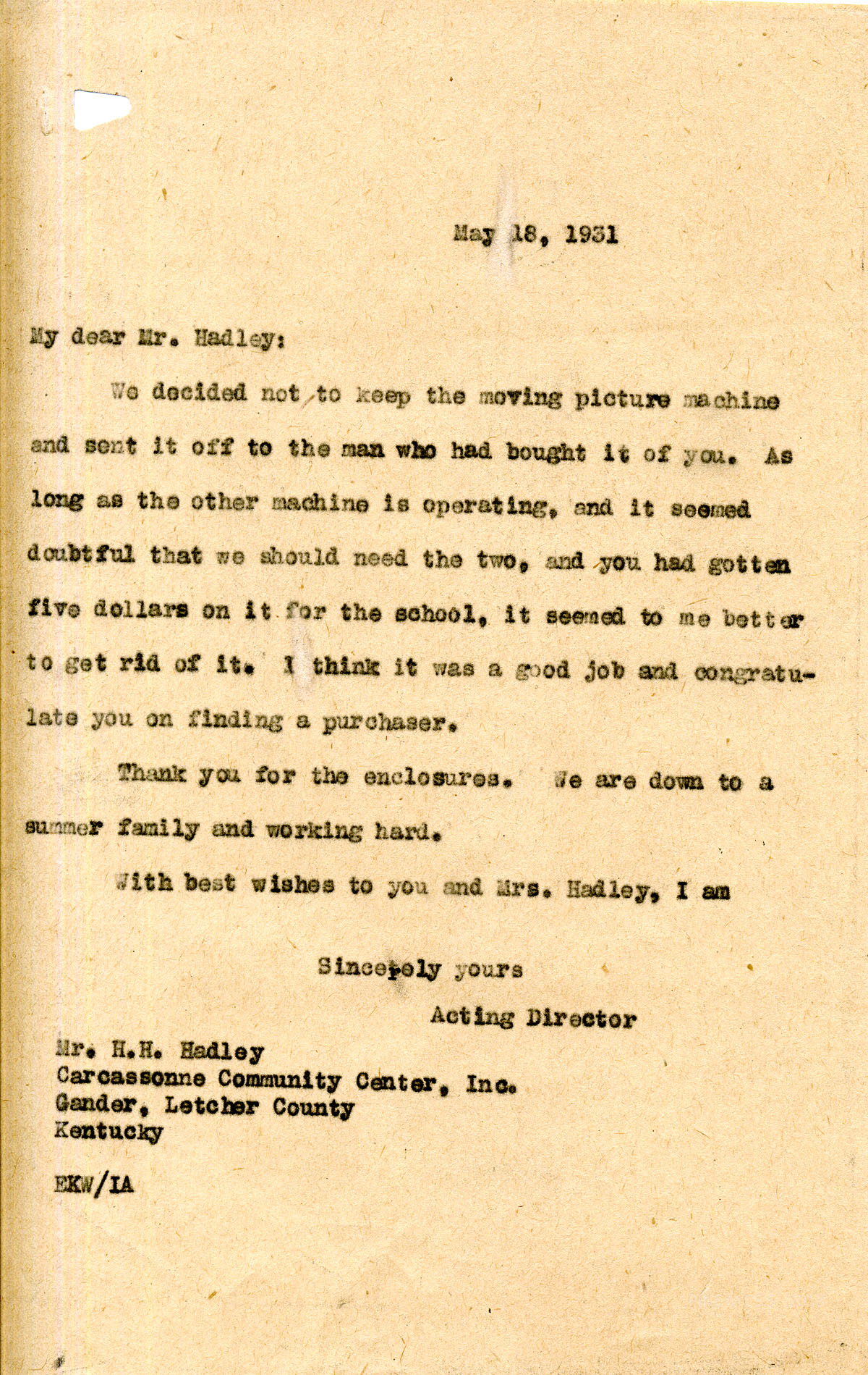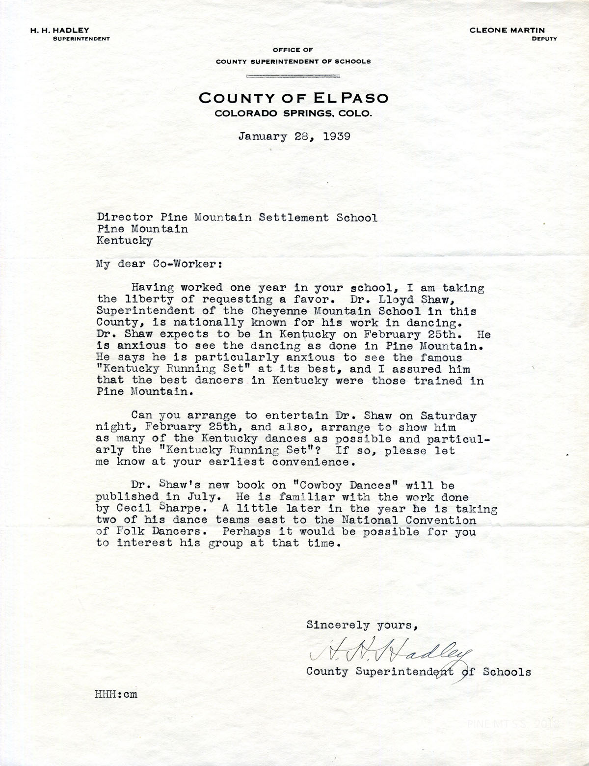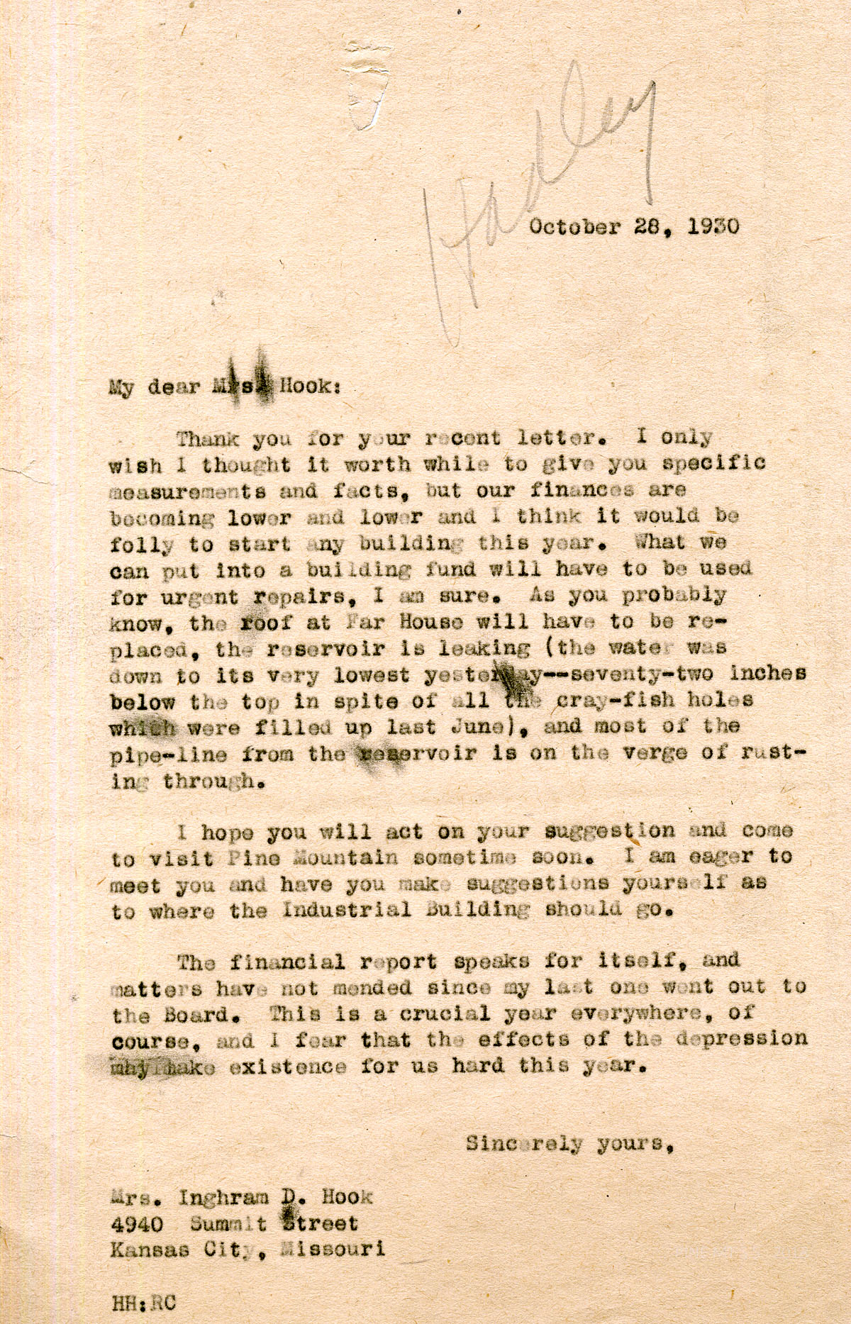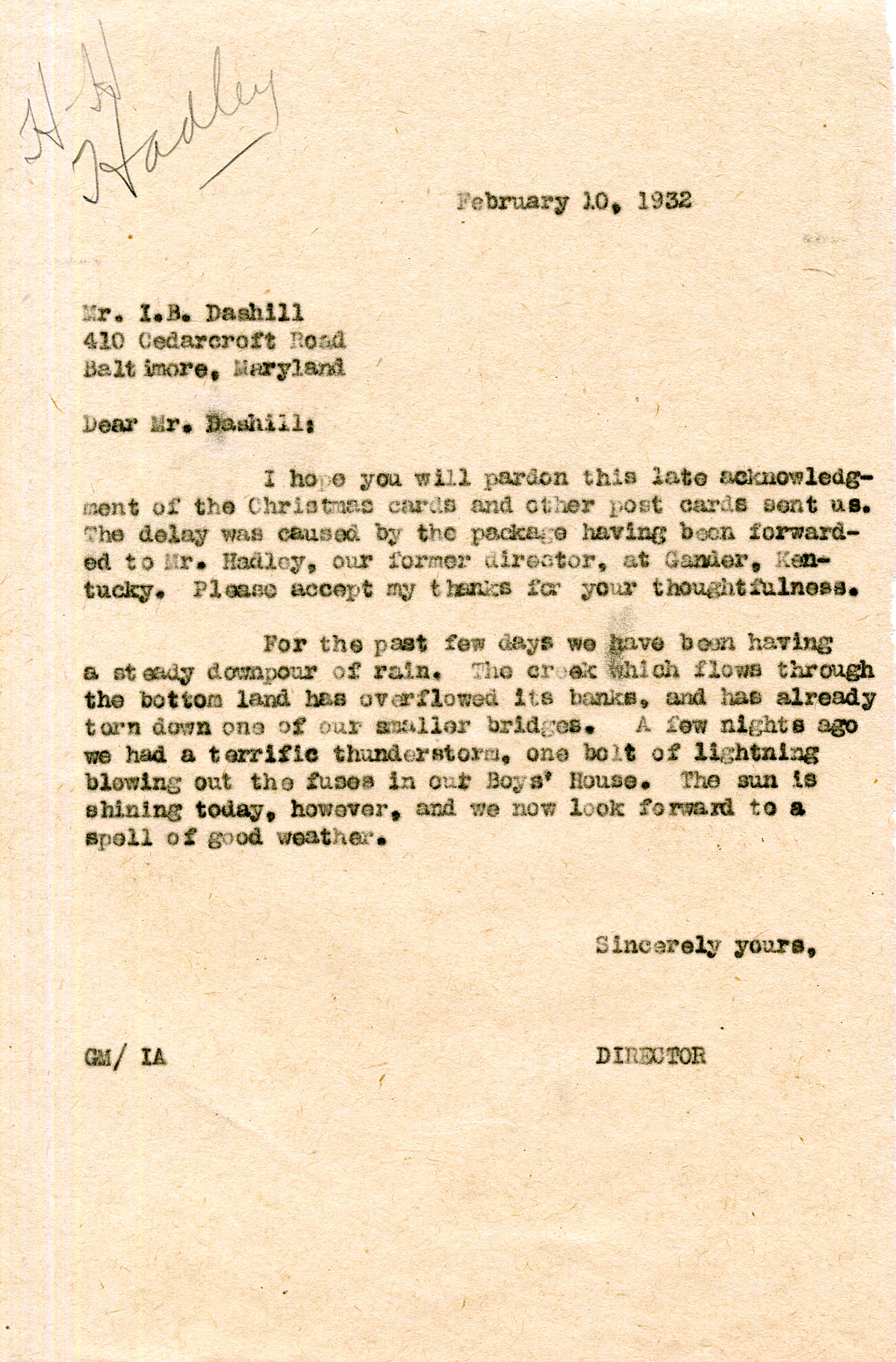 Hubert Hadley Correspondence displays images of letters, dated 1929 to 1939, to and from the Director of Pine Mountain Settlement School who served for one year, 1930-1931. Hubert Hadley’s term was just prior to that of Glyn Morris who succeeded him as PMSS Director and stayed for nearly ten years. Much of the correspondence in his file is with his successor, as he was working not far away at Carcassonne Community Center in Letcher County, Kentucky.