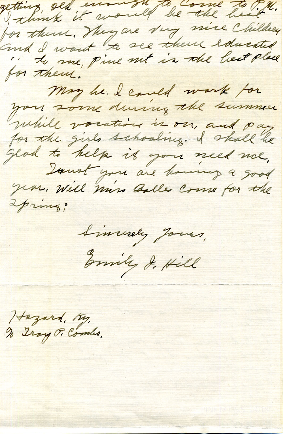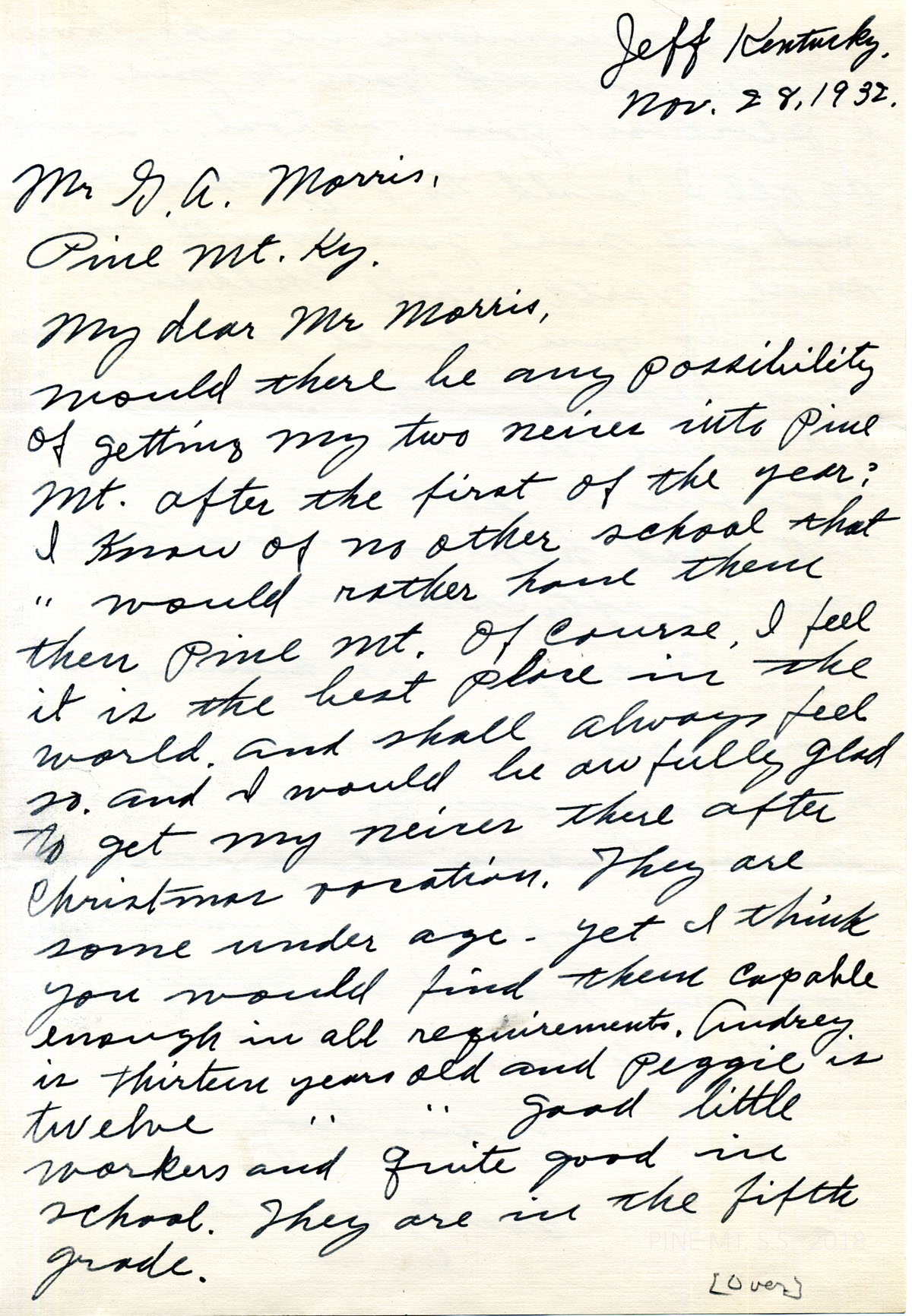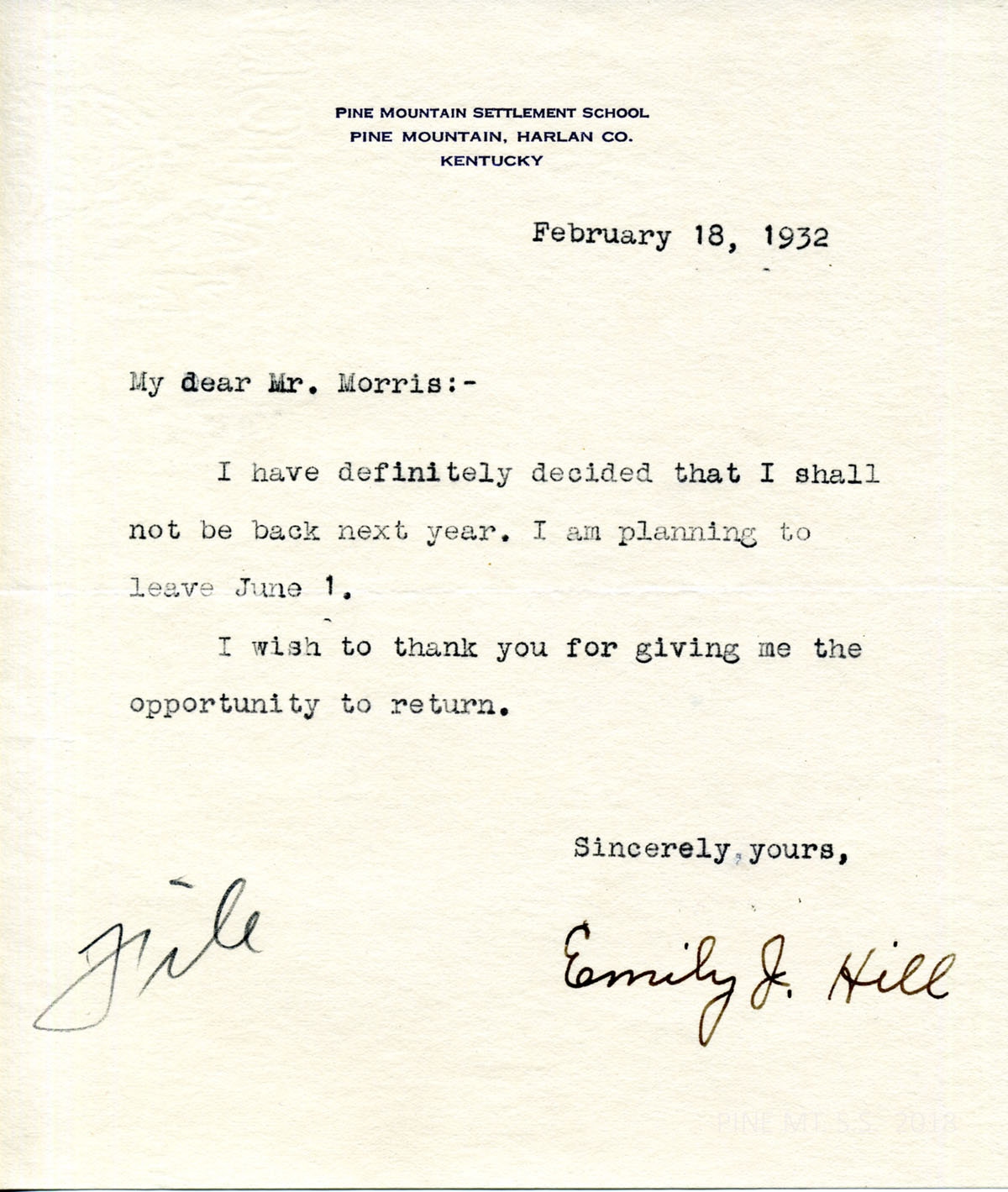 True to her propensity to care for others, Emily Hill wrote to Glyn Morris in November 1932 (image 005), asking if he would be able to accept her two nieces into the Pine Mountain School. She stated that “I know of no other school that I would rather have them than Pine Mt. Of course, I feel it is the best place in the world and shall always feel so…I would do all I could to pay their way…”