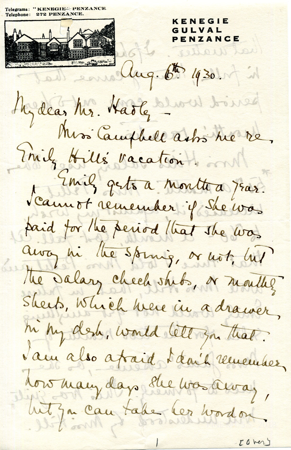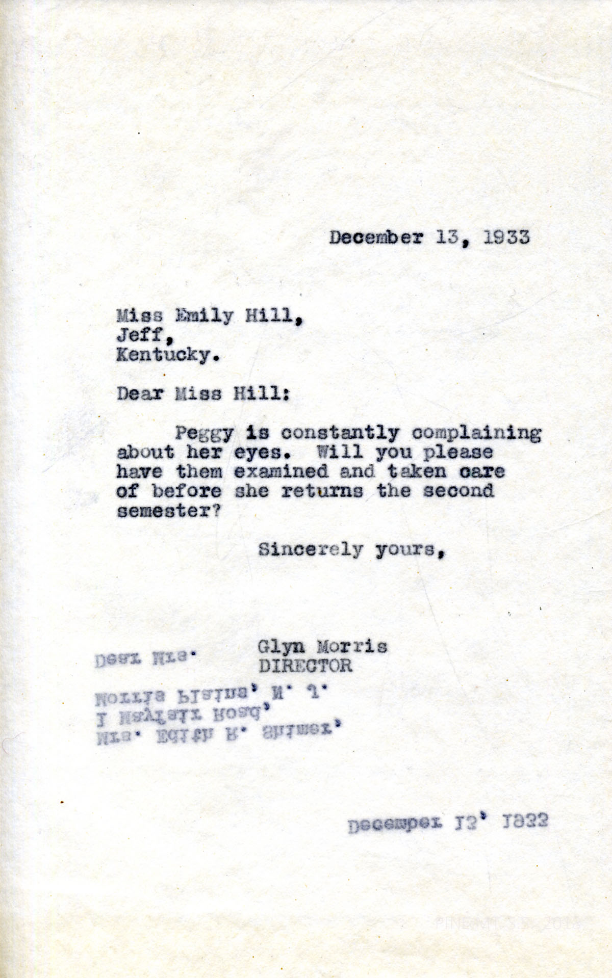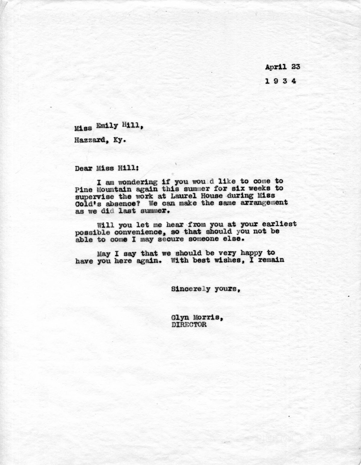 True to her propensity to care for others, Emily Hill wrote to Glyn Morris in November 1932 (image 005), asking if he would be able to accept her two nieces into the Pine Mountain School. She stated that “I know of no other school that I would rather have them than Pine Mt. Of course, I feel it is the best place in the world and shall always feel so…I would do all I could to pay their way…”