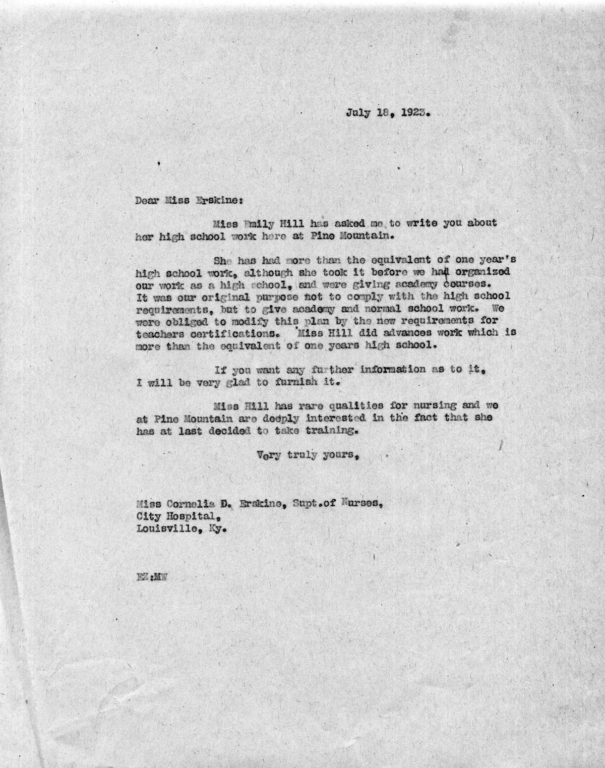 Mrs. Zande had written this in a reference letter (image 001) for Miss Hill to the Superintendent of Nurses, City Hospital, Louisville, Kentucky, in 1923. The letter mentions that Miss Hill was applying to study nursing, although nothing was found in the Archives indicates that she was able to follow through with those plans.
