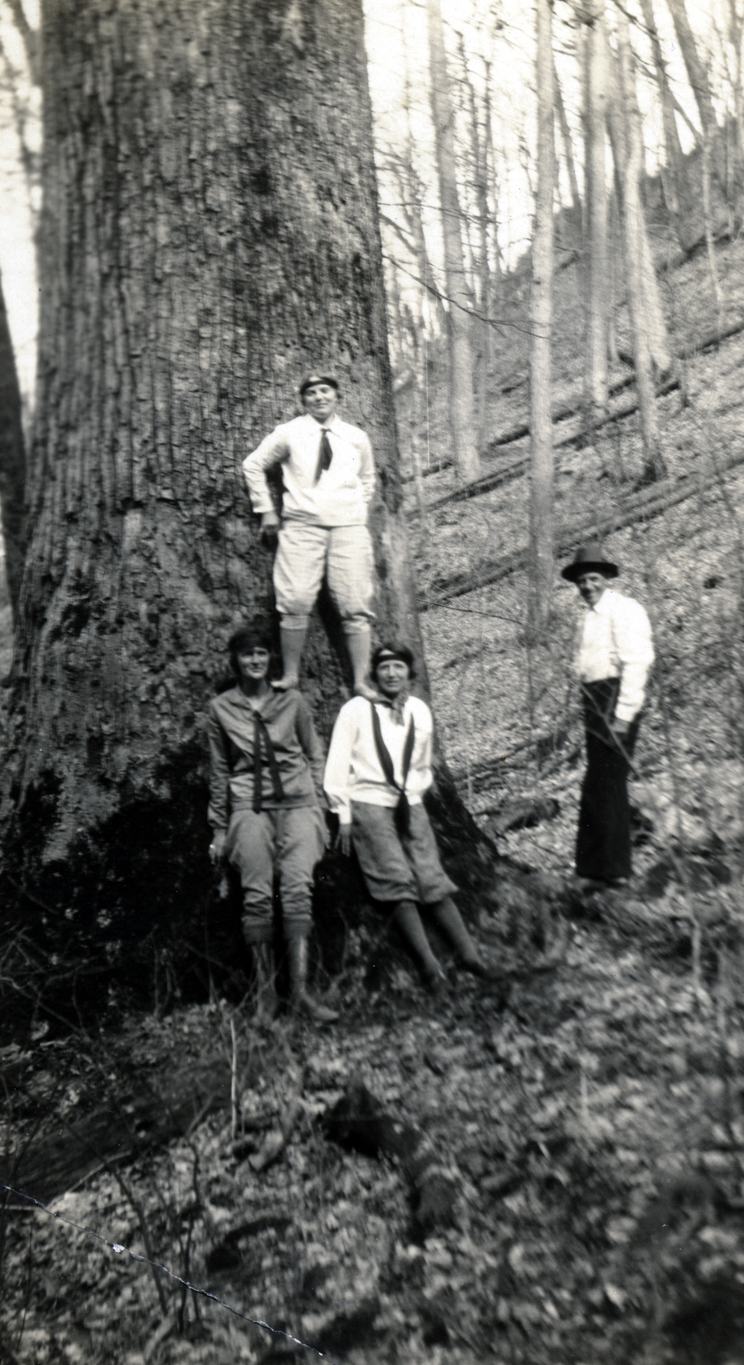 - Three women at base of large poplar tree. Emily Hill is standing on shoulder of other women. Columbus Creech [?] is to the right. [X_100_workers_2538_mod.jpg]
