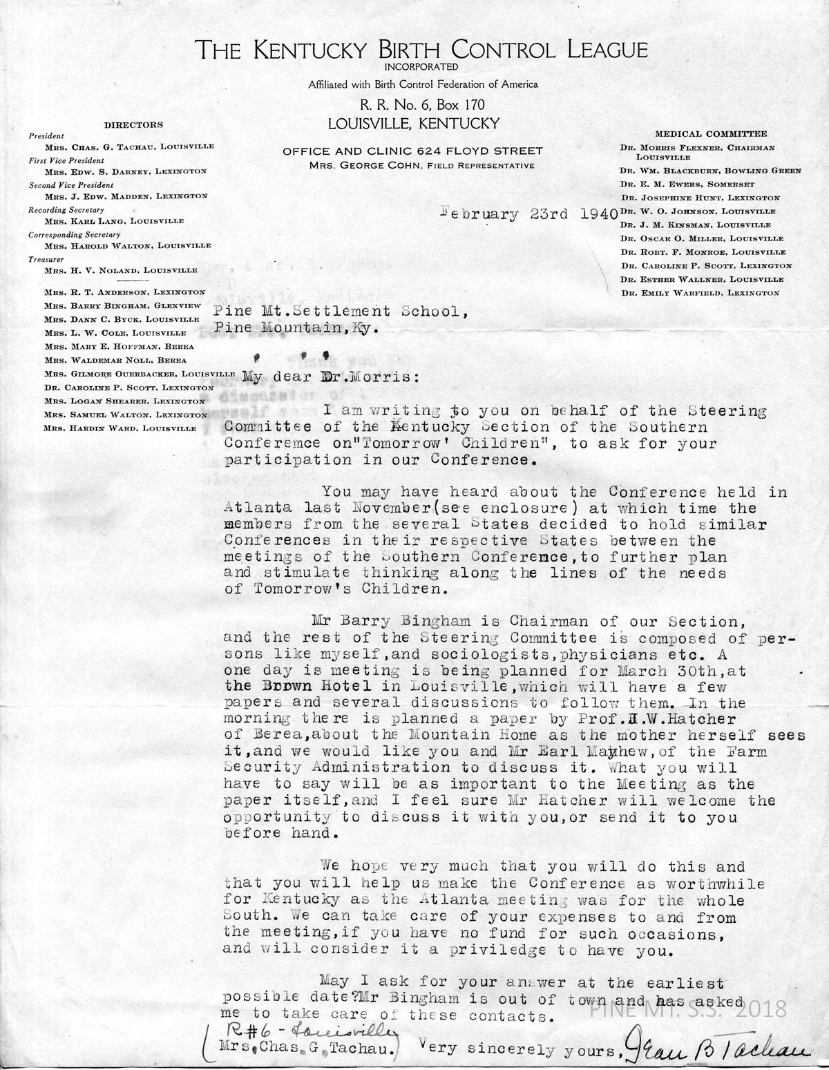 Tachau invites Morris to participate in the Kentucky Section of the Southern Conference (an outgrowth of the Conference held in Atlanta in November 1939) to discuss the book “Tomorrow’s Children,” to be held at the Brown Hotel in Louisville, KY, on March 30. Mr. Barry Bingham is Chairman of the KY section. Title of conference: “Mountain Home as the mother herself sees it.”