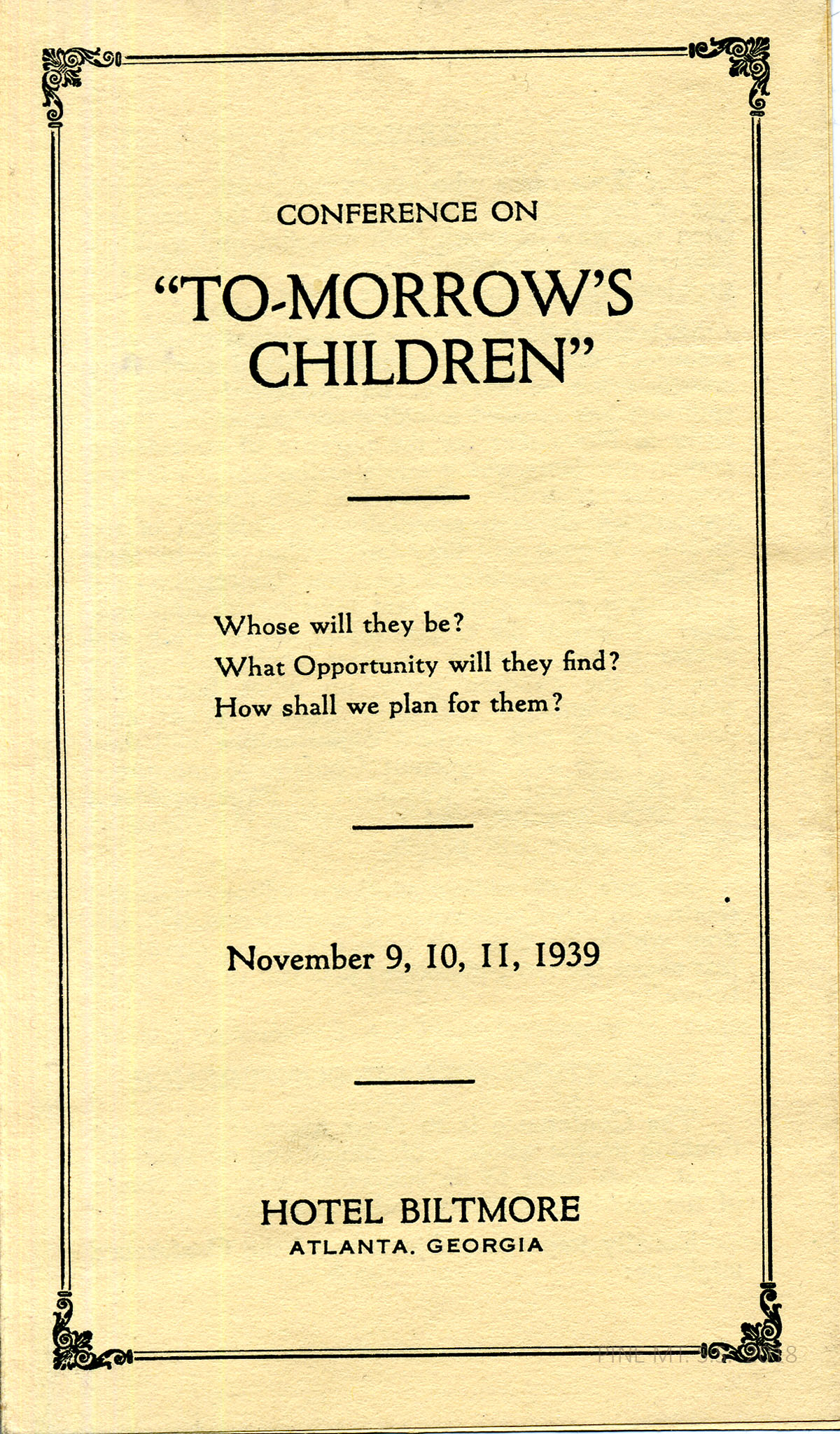 Brochure: “Conference on ‘Tomorrow’s Children,’ November 9, 10, 11, 1939.” Cover and 3 pages.