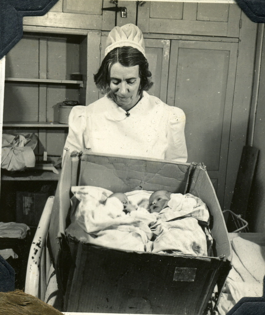 Grace Rood Album II. Grace Rood with two infants in paper box. [rood_145.jpg]