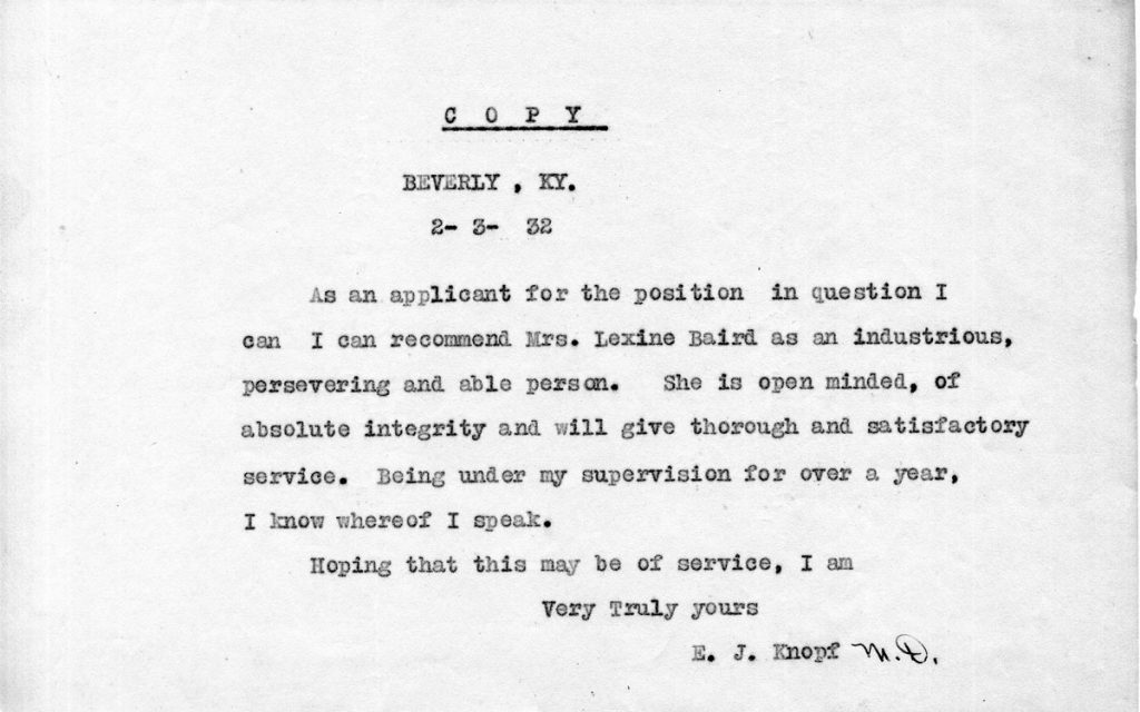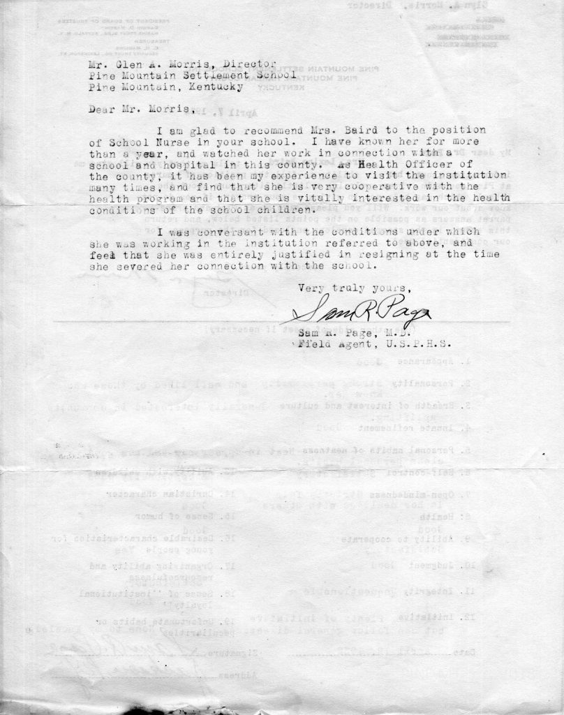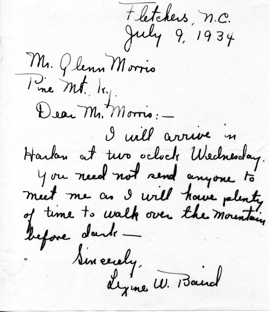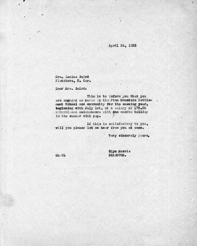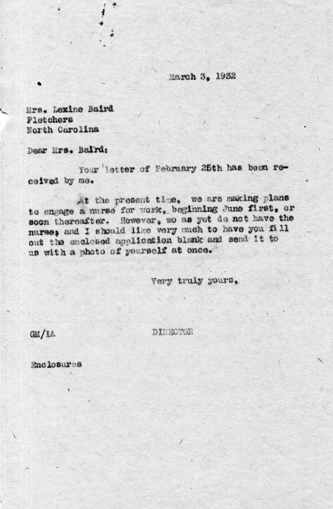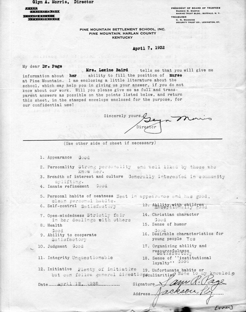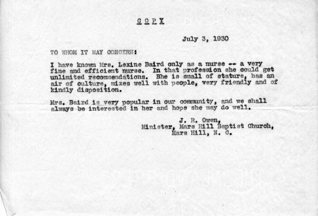 TAGS: Lexine Baird Correspondence I; Lexine W. Baird; medical; nurses; Glyn Morris; Alice Cobb; Arthur Dodd; Highland Hospital, Asheville, NC; Mars Hill College; Kendricks; Rachel Lewis; Medical Settlement Big Laurel; Meriweather Hospital; Syndenham Hospital, Baltimore, ME