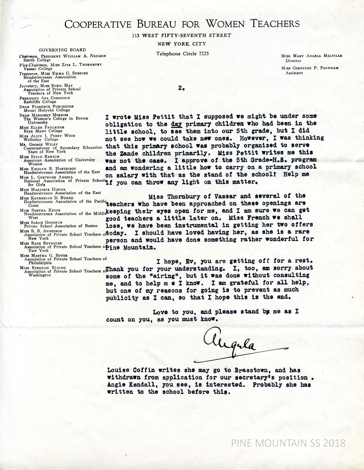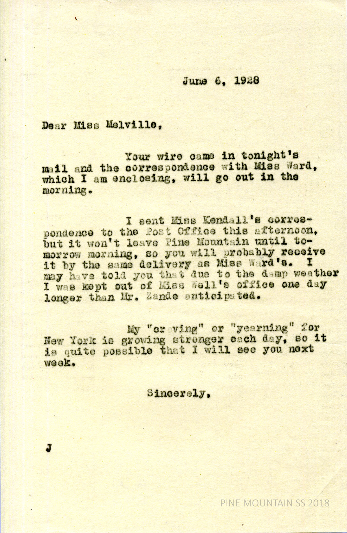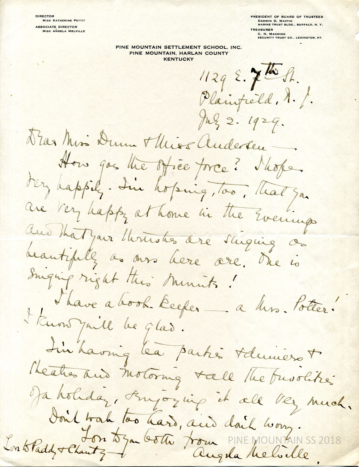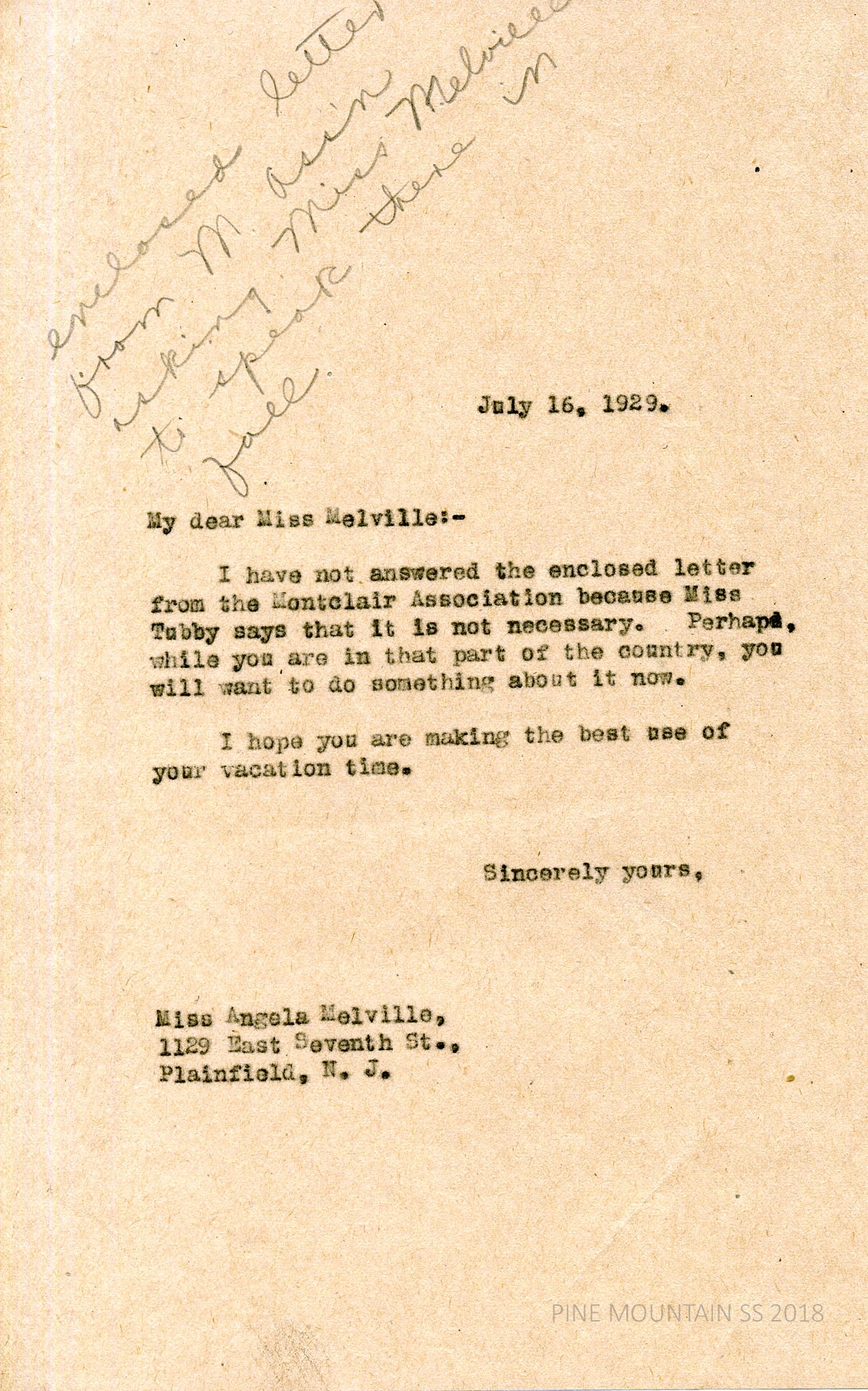 The later letters in this group indicate Melville’s plans to return to Pine Mountain due to the death of the School’s Co-Director Ethel de Long Zande in 1928. Melville was re-hired to serve as Associate Director of the Pine Mountain School for two years with full charge of the academic work, the office and the fiscal promotion of the School, all of which had been under the care of the late Mrs. Zande. Miss Katherine Pettit was to continue as Director.