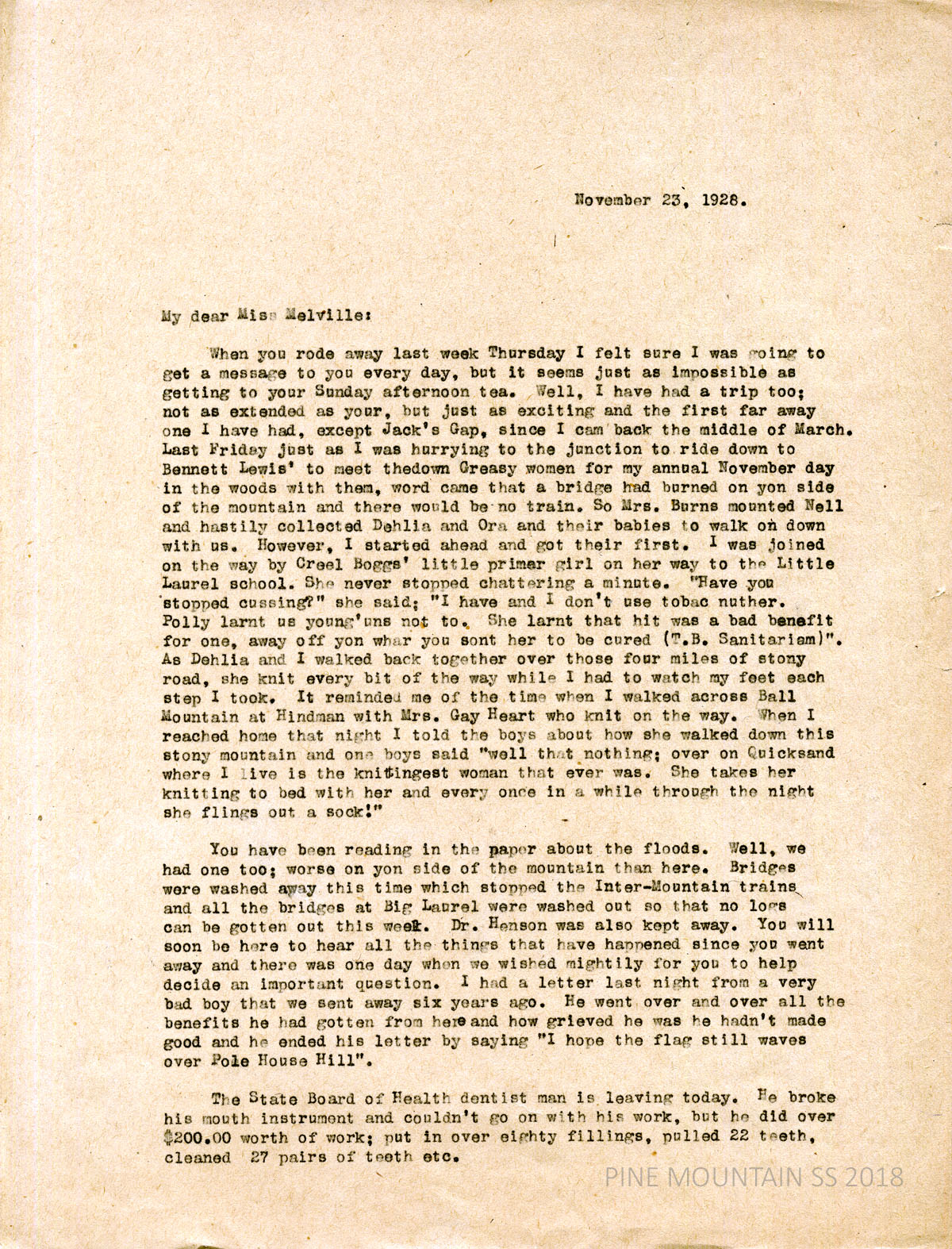 [melville_corr_049.jpg] Unsigned to Melville, November 23, 1928. Describes her “annual day in the woods” with the “down Greasy women,” mentioning Bennett Lewis, Mrs. Burns, Dehlia (sic), Ora, Creel Boggs’ little primer girl; told story of Mrs. Gay Heart and her knitting. Flooding destroyed bridges, keeping Dr. Henson away; quotes from letter from a former student; tells about the State Board of Health dentist and his work.
