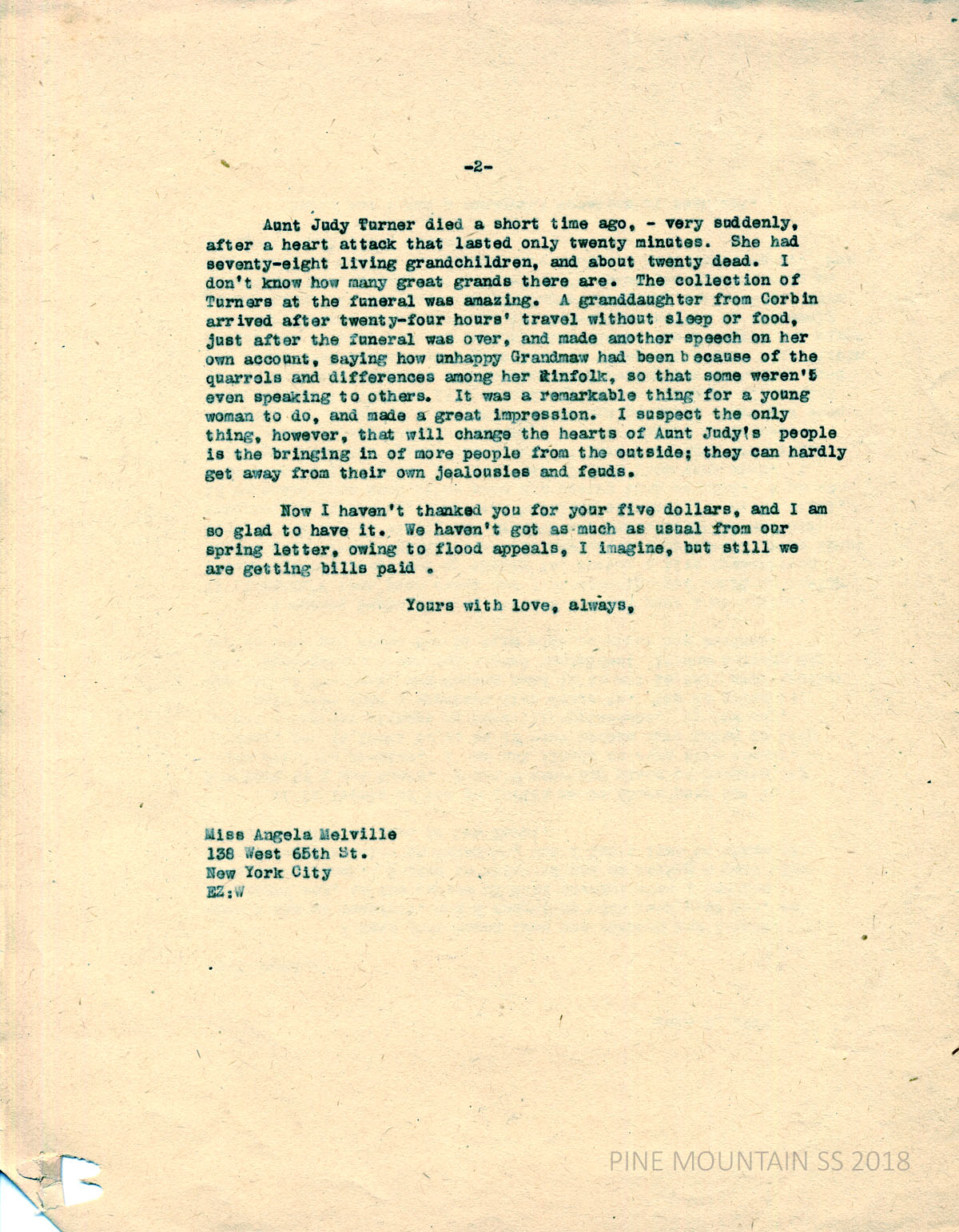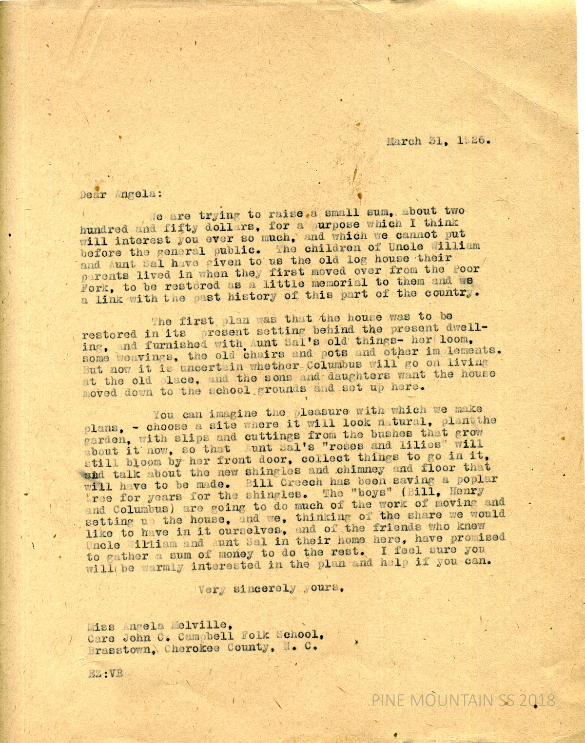 [melville_corr_002.jpg] – Ethel de Long Zande to Melville, care of John C. Campbell Folk School, Brasstown, NC, March 31, 1926. Raising about $250 to restore William and Sal Creech’s log cabin as a memorial to them. The Creech children want to move it to the school grounds; describes restoration plans.