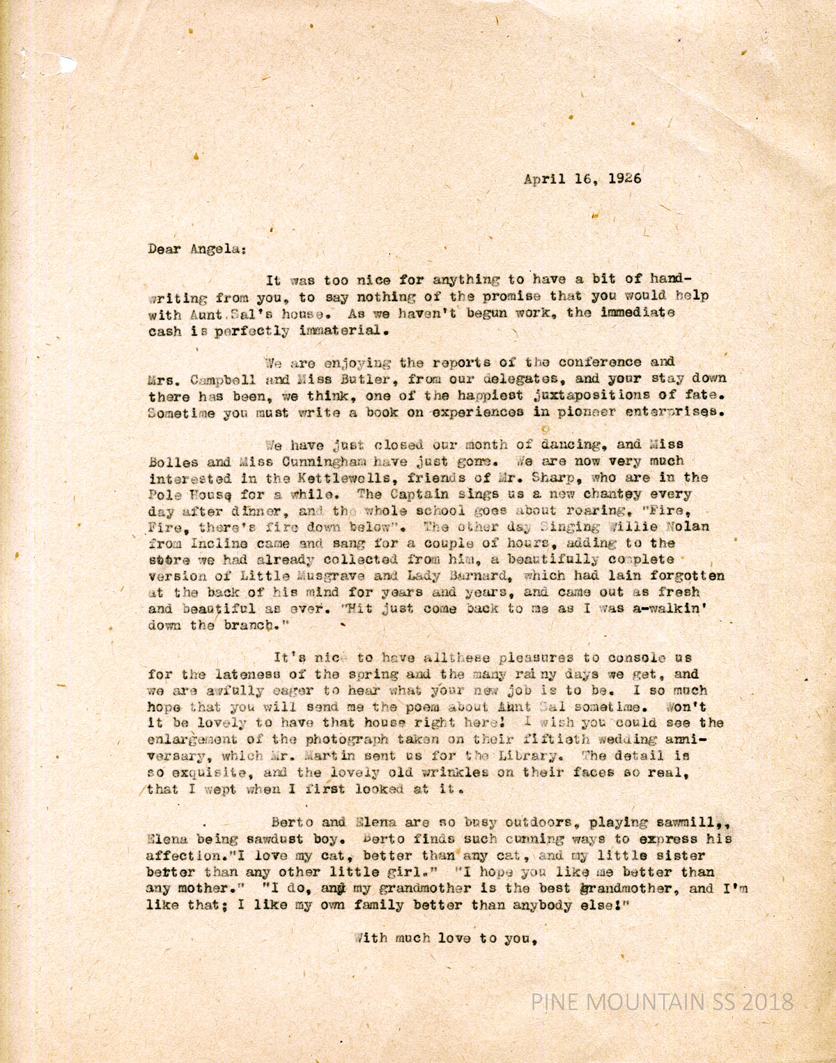 [melville_corr_003.jpg] Unsigned to Melville, April 16, 1926. Acknowledges Melville’s promise to help with “Aunt Sal’s home.” Comments on Melville’s stay at J.C. Campbell Folk School during a conference. A month of dancing has ended and Miss [Dorothy] Bolles and Miss Cunningham have left. “We are now very much interested in the Kettlewells, friends of Mr. [Cecil] Sharp” who are visiting; Singing Willie Nolan visited with newly remembered songs. Mr. [Darwin D.] Martin sent enlargement of photo of the Creech’s 50th wedding anniversary for the library; mentions Berto and Elena [Zande].