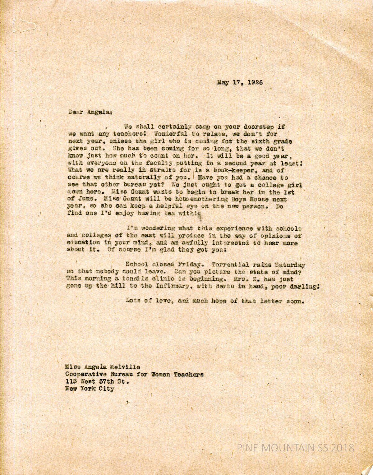 [melville_corr_006.jpg] Unsigned to Melville at the Cooperative Bureau for Women Teachers, NYC, May 17, 1926. The School doesn’t need teachers for now but are “in straits” for a bookkeeper. Miss Gaunt can train her while serving as housemother at Boys House. Tonsils clinic is beginning; Mrs. Zande is taking Barto to it.