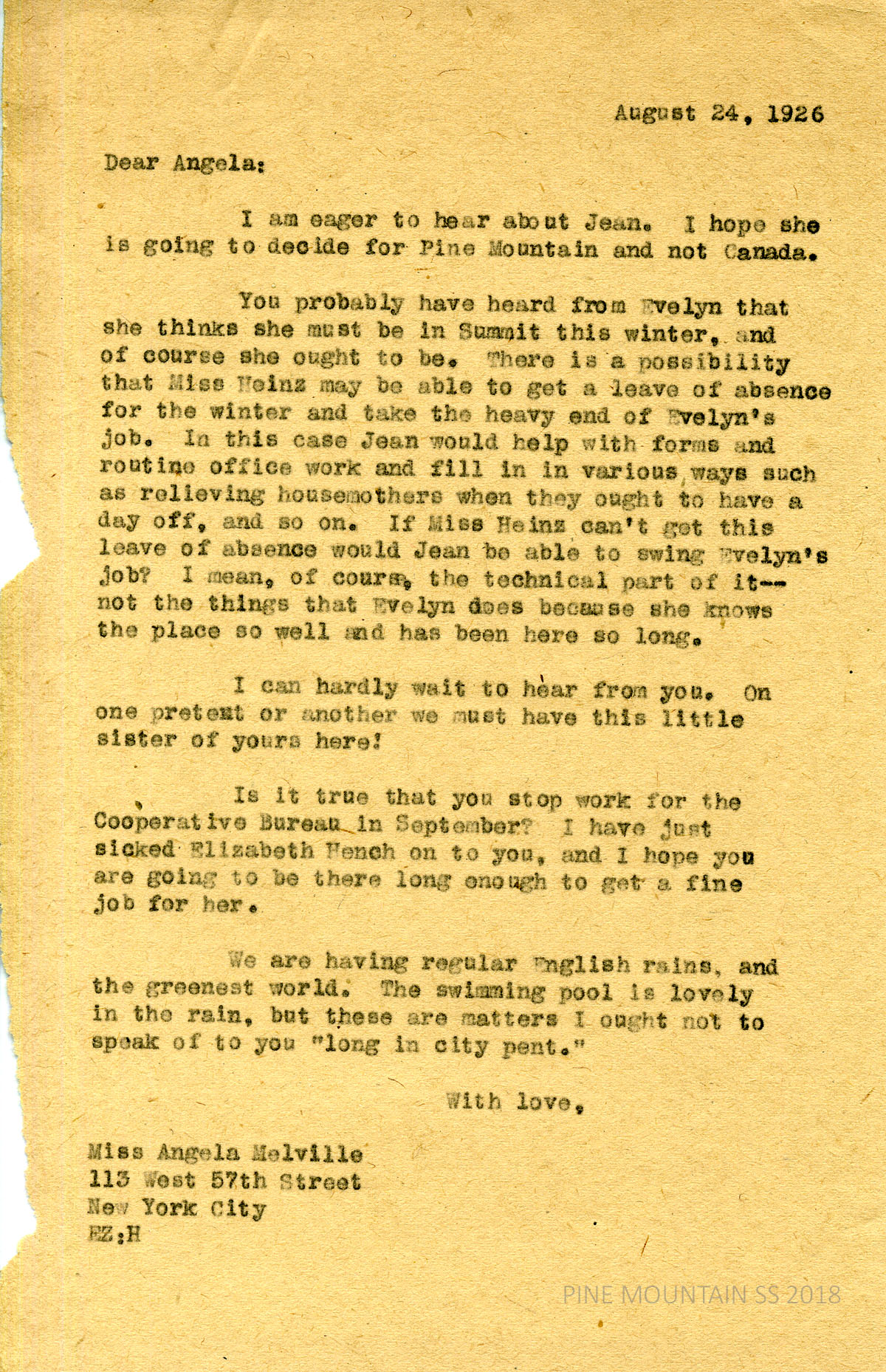 [melville_corr_010.jpg] Zande to Melville in NYC, August 24, 1926. Evelyn [Wells] to be in Summit this winter; Miss Heinz may be able to fill in Wells’ job; describes the tasks Jean would do. Referring Elizabeth Hench to Melville for a job in NYC.