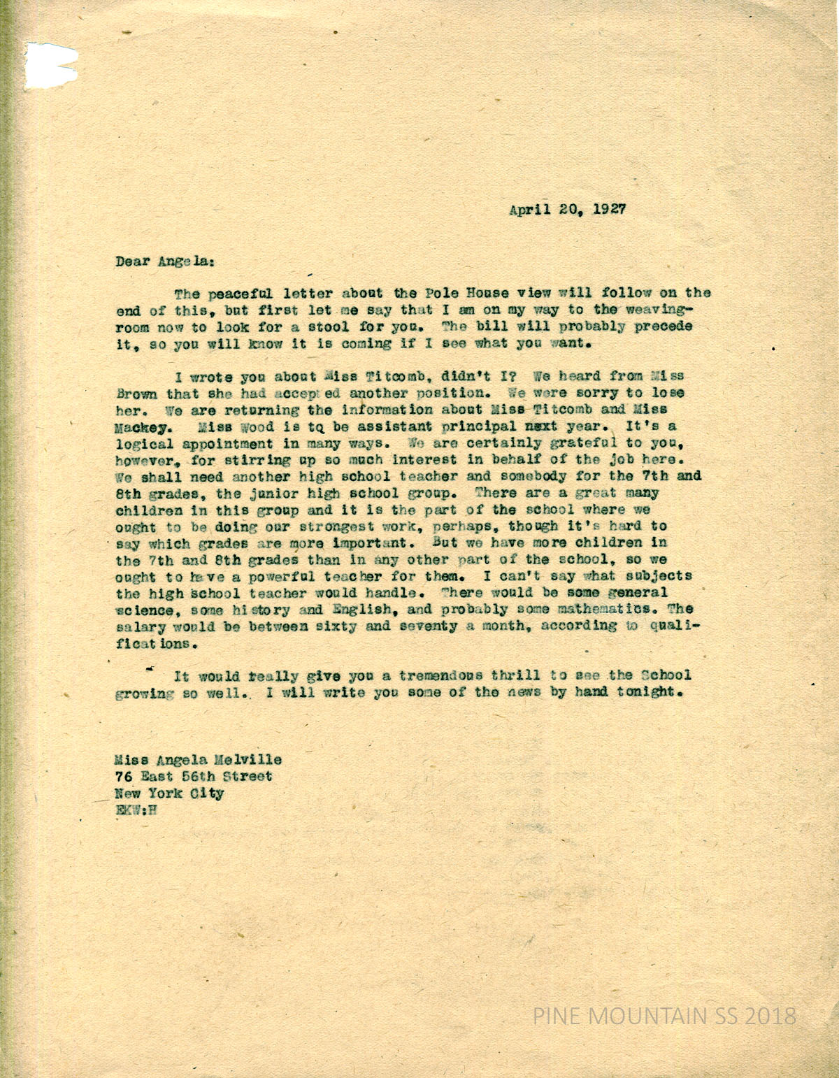 [melville_corr_014.jpg] Wells to Melville in NYC, April 20, 1927. Will send Melville a stool from the weaving room; Miss Titcomb; Miss Brown accepted another position; Miss Mackey; Miss Wood to be assistant principal next year; need an additional high school teacher, whose salary would be between $60 and $70 a month.