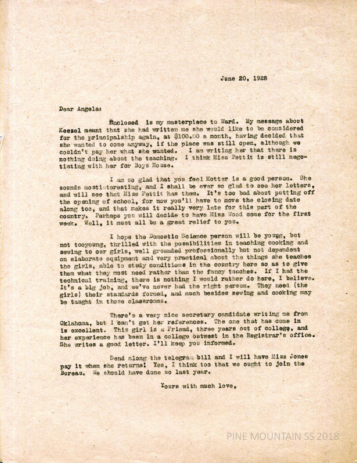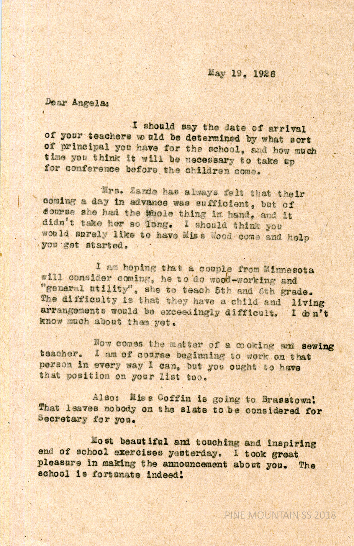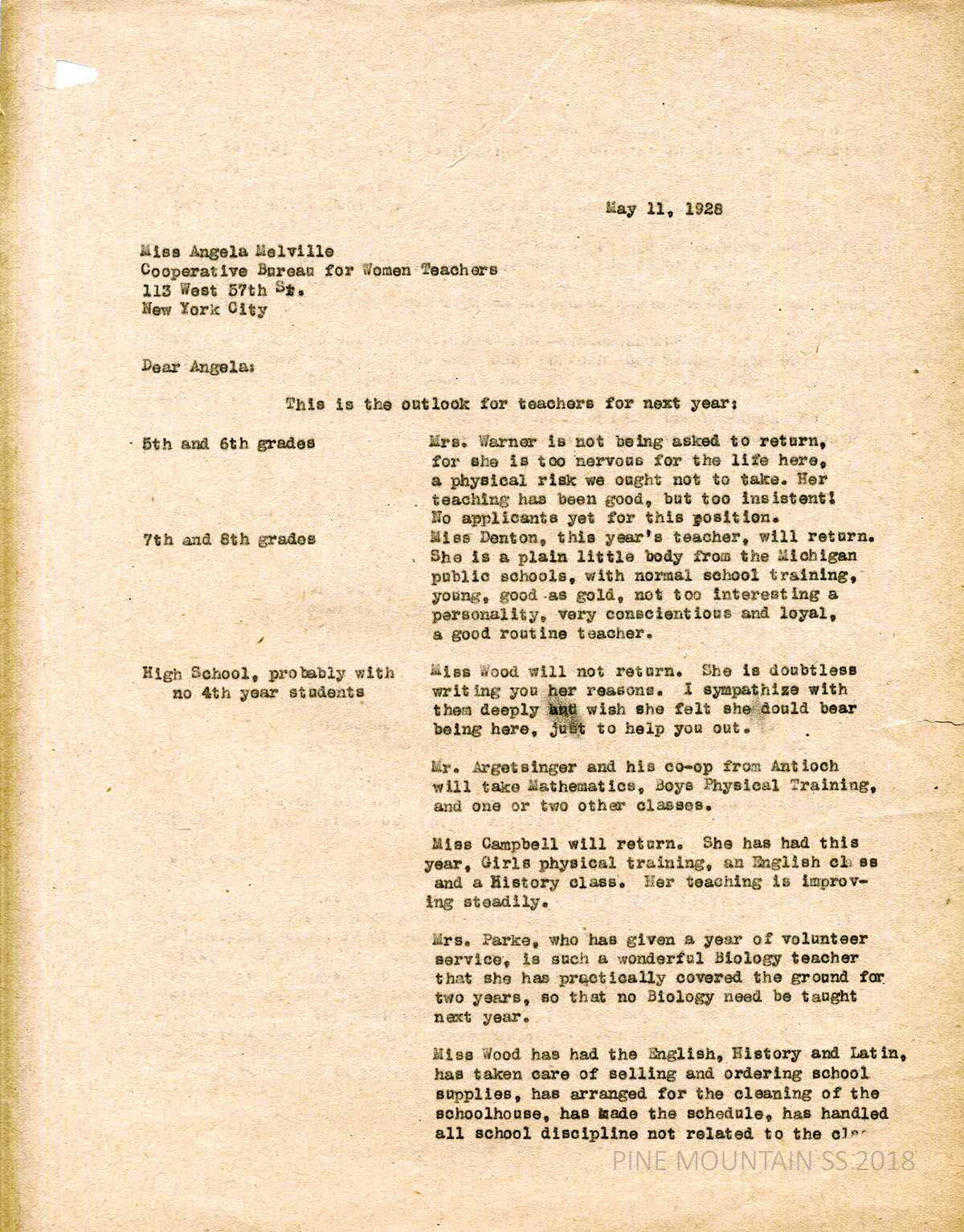 TAGS: ANGELA MELVILLE Correspondence 1925-1929, Evelyn K. Wells, Ethel de Long Zande, Katherine Pettit, School updates, job applicants, hiring, restoring Aunt Sal’s Cabin, teachers, office staff