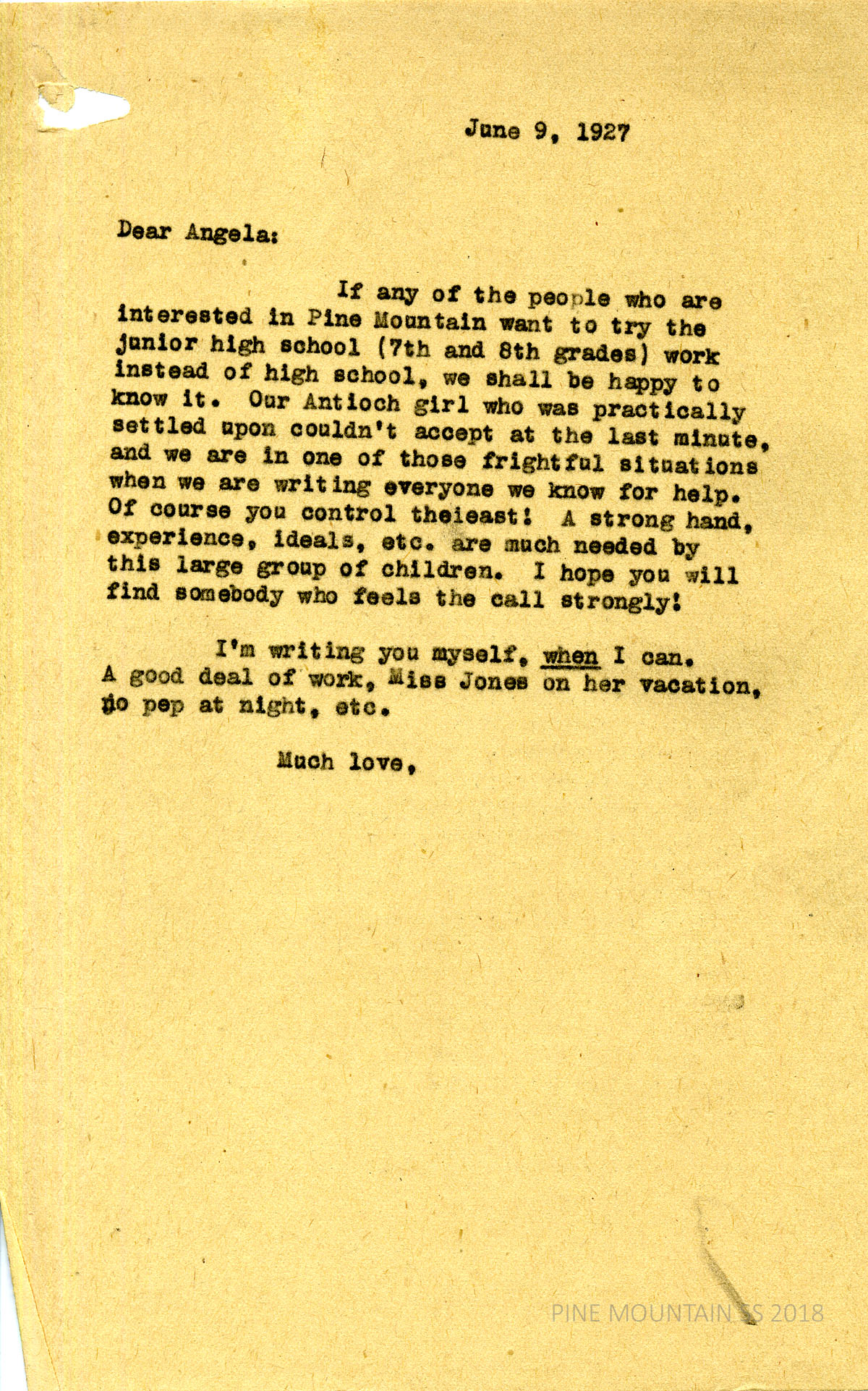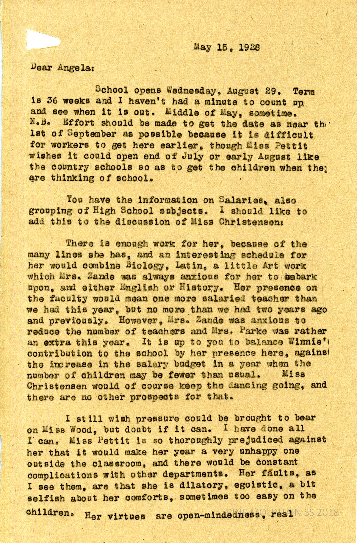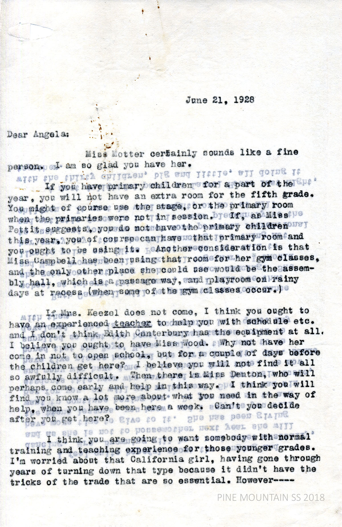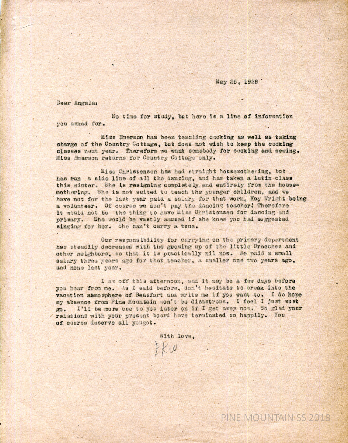 TAGS: ANGELA MELVILLE Correspondence 1925-1929, Evelyn K. Wells, Ethel de Long Zande, Katherine Pettit, School updates, job applicants, hiring, restoring Aunt Sal’s Cabin, teachers, office staff