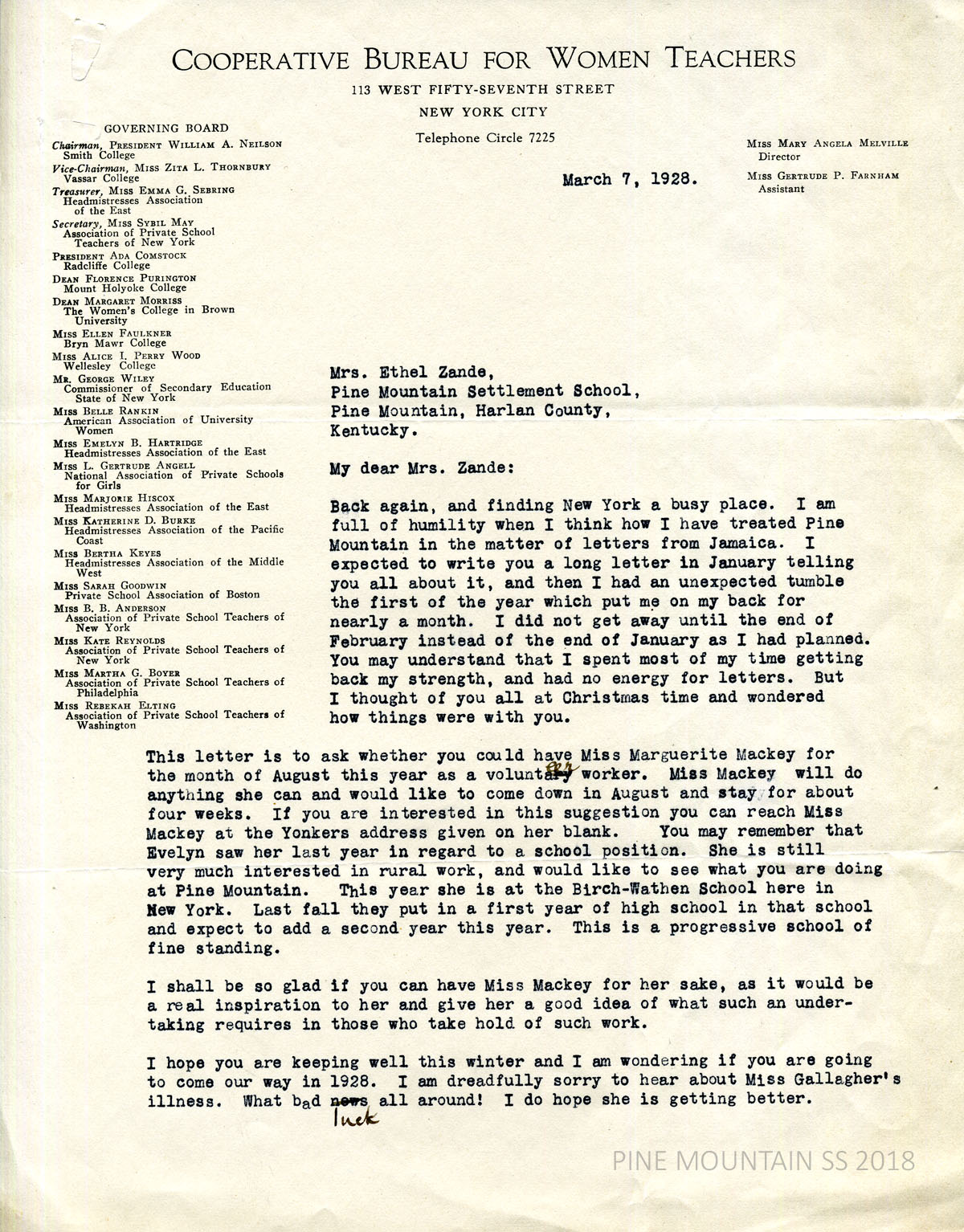 [melville_corr_017.jpg] and [melville_corr_017a.jpg] Melville in NYC to Zande, March 7, 1928, 2 pages. (Typewritten original on “Cooperative Bureau for Women Teachers” letterhead.) Didn’t write from Jamaica because of a back injury. Asks if PMSS would accept Miss Marguerite Mackey, a teacher at the Birch-Wathen School, as a volunteer worker for 4 months. Regrets to hear of Miss Gallagher’s illness.