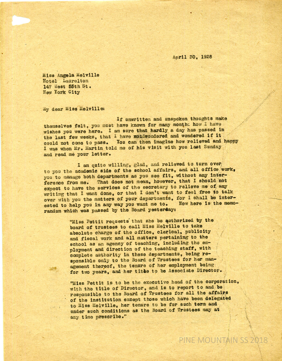 [melville_corr_019.jpg] and [melville_corr_019a.jpg] Pettit to Melville in NYC, April 30, 1928, 2 pages. Mr. Martin visit with Melville; “I am quite willing, glad, and relieved to turn over to you the academic side of the School affairs, and all office work….” Quotes the Board’s memorandum about hiring Melville as Associate Director for two years and Miss Pettit as Director. (page 2) Describes the differences of opinions whether Miss Wood should continue at PMSS.