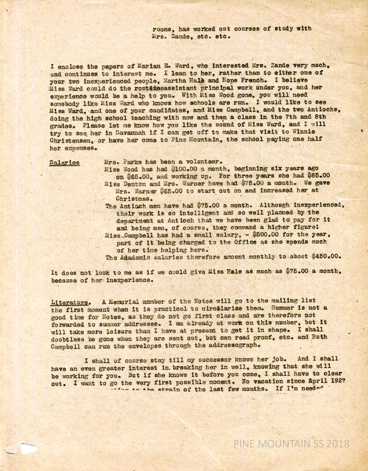 (page 2) Encloses papers of applicant Marian E. Ward in Savannah; provides a list of the teachers’ salaries and updates on PMSS literature, such as a memorial NOTES; “Ruth Campbell can run the envelopes through the addressograph.” Informs Melville of her plans concerning leaving PMSS. “I want to go the very first possible moment [due to] strain of the last few months.”
