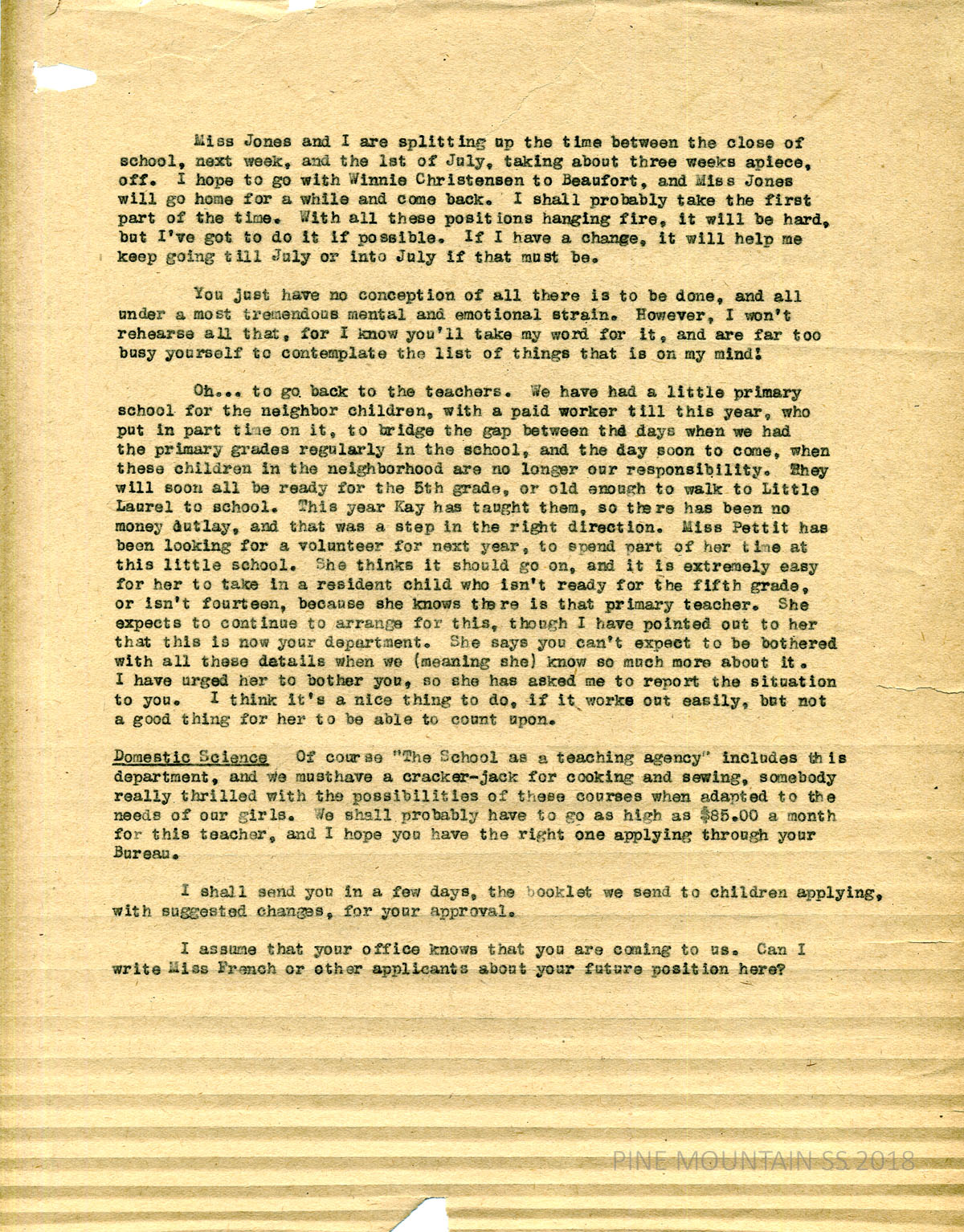 (page 3) Summer plans with Miss Jones & Winnie Christensen; need a volunteer for the neighborhood primary school, which Kay had been teaching. Need a “cracker-jack [teacher] for cooking and sewing” in the Domestic Science Department.