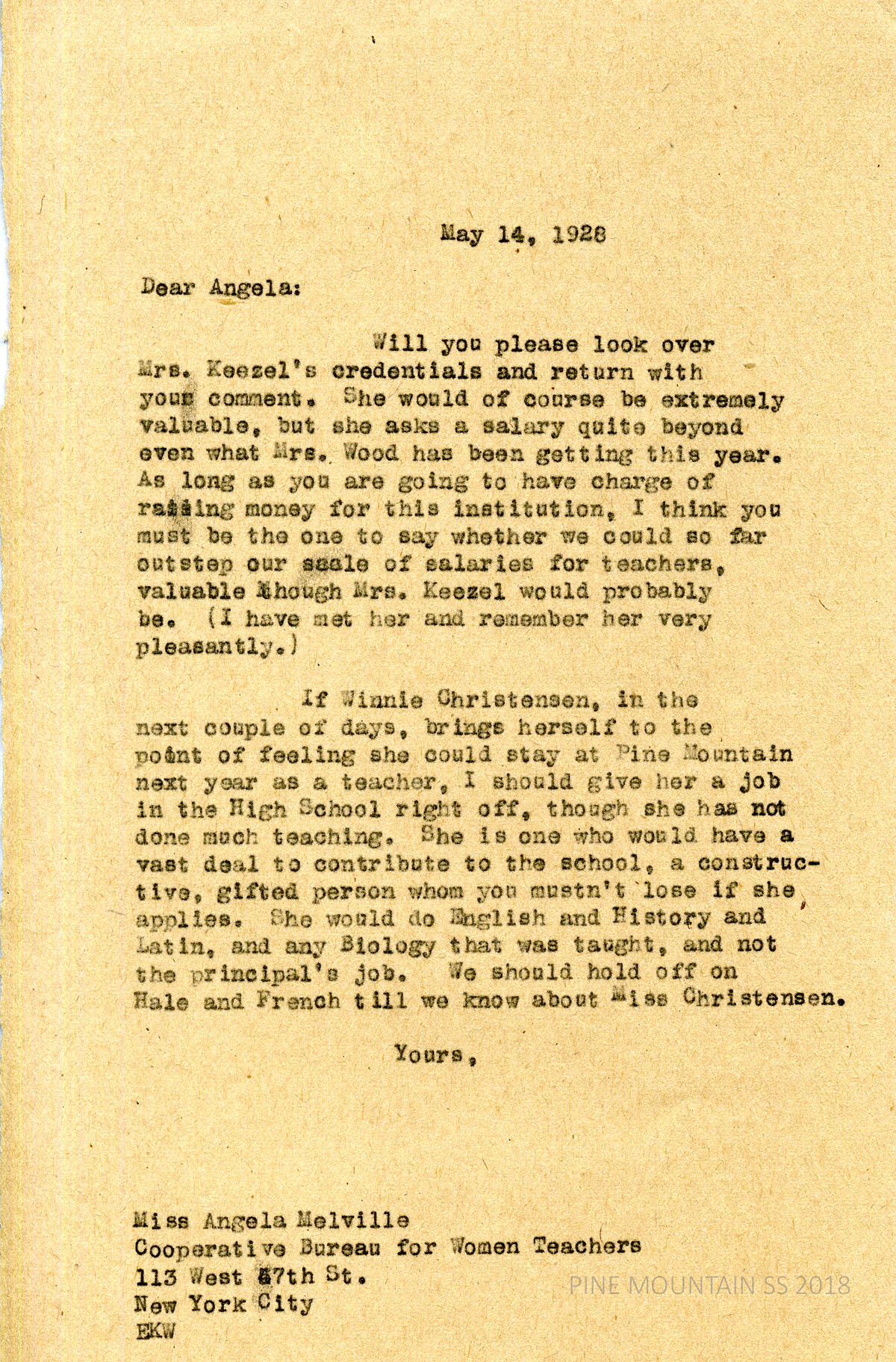[melville_corr_023.jpg] Wells to Melville in NYC, May 14, 1928. Sent credentials for Mrs. Keezel; may hire Winnie Christensen as teacher if she stays at PMSS next year, “a constructive, gifted person.” Other hiring suggestions.