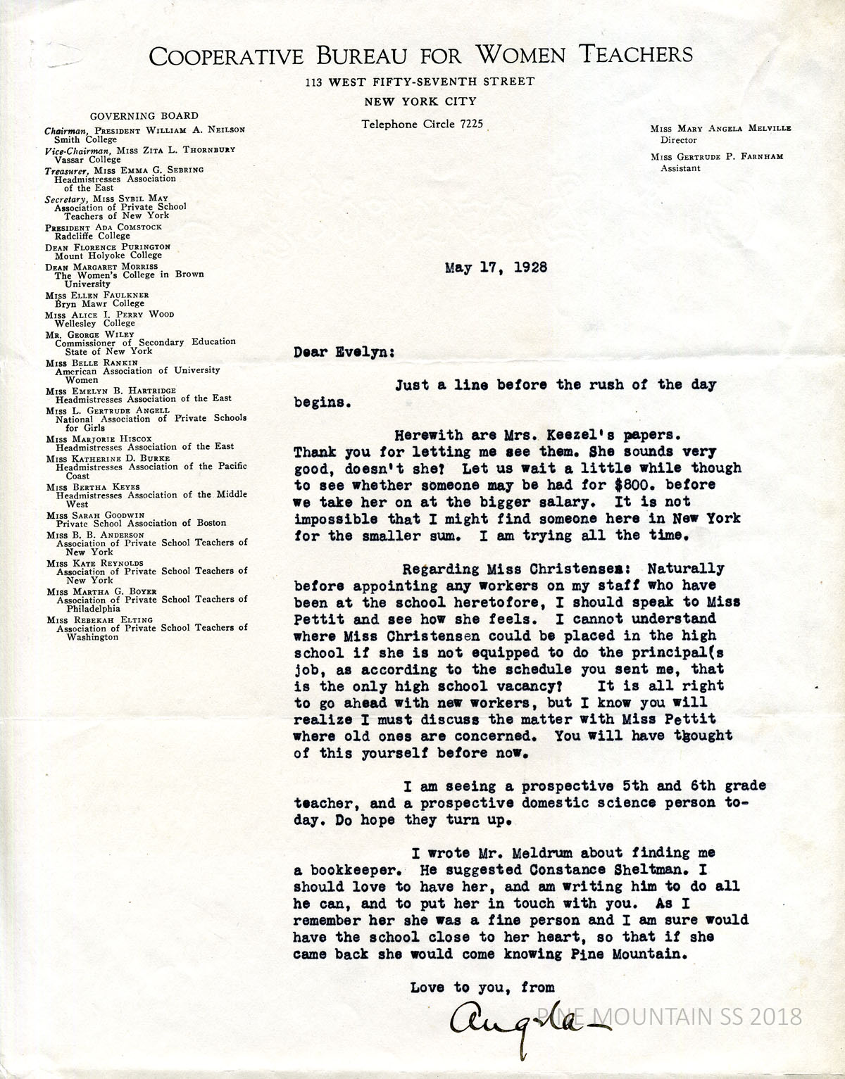 [melville_corr_026.jpg] Unsigned to Melville in NYC, May 19, 1928. Continued discussion of PMSS opening date and prospective hires; Miss Coffin is going to Brasstown, leaving an empty secretary position.
