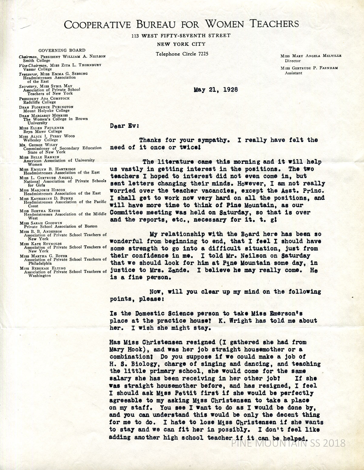 [melville_corr_027.jpg] and [melville_corr_027a.jpg] Melville to Wells, May 21, 1928, on letterhead for “Cooperative Bureau for Women Teachers,” NYC (typewritten original), 2 pages. Has more time to help with PMSS teacher vacancies; invited Mr. Neilson to visit PMSS. Questions about Miss Emerson, and Miss Christensen, (page 2); would like to end the day primary school; Miss Thornbury of Vassar is helping with finding PMSS teachers; sorry about some of the “airing.”
