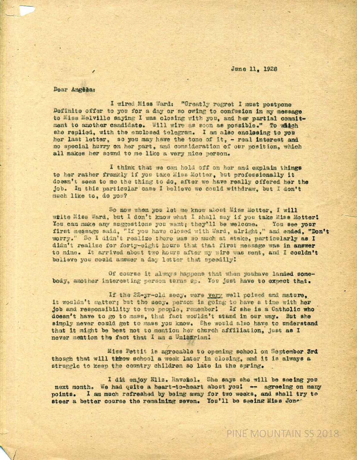 [melville_corr_033.jpg] (Truncated closing) to Melville, June 11, 1928. Wired Miss Ward explaining delay in offering position; discusses problem with withdrawing offer if Motter is hired and that the secretary’s problems with being Catholic. Enjoys visiting with Elizabeth Ravenel in Beaufort; Miss Jones (truncated ending).