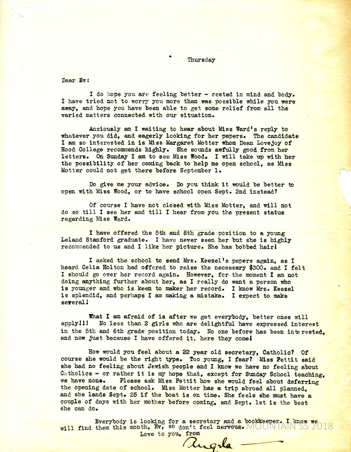 [melville_corr_034.jpg] Melville to Wells, “Thursday” (no date), (typewritten original). “…so interested in…Miss Margaret Motter whom Dan Lovejoy of Hood College recommends highly. She sounds awfully good from her letters.” Asked advice on having Miss Wood help open School or wait until Motter’s arrival. Offered position to a Leland Stanford graduate. “She has bobbed hair!” Considering the hiring of Mrs. Keezel, since Celia Holton “had offered to raise the necessary $300.” Asked about Wells’ feeling about hiring a young Catholic girl as secretary.