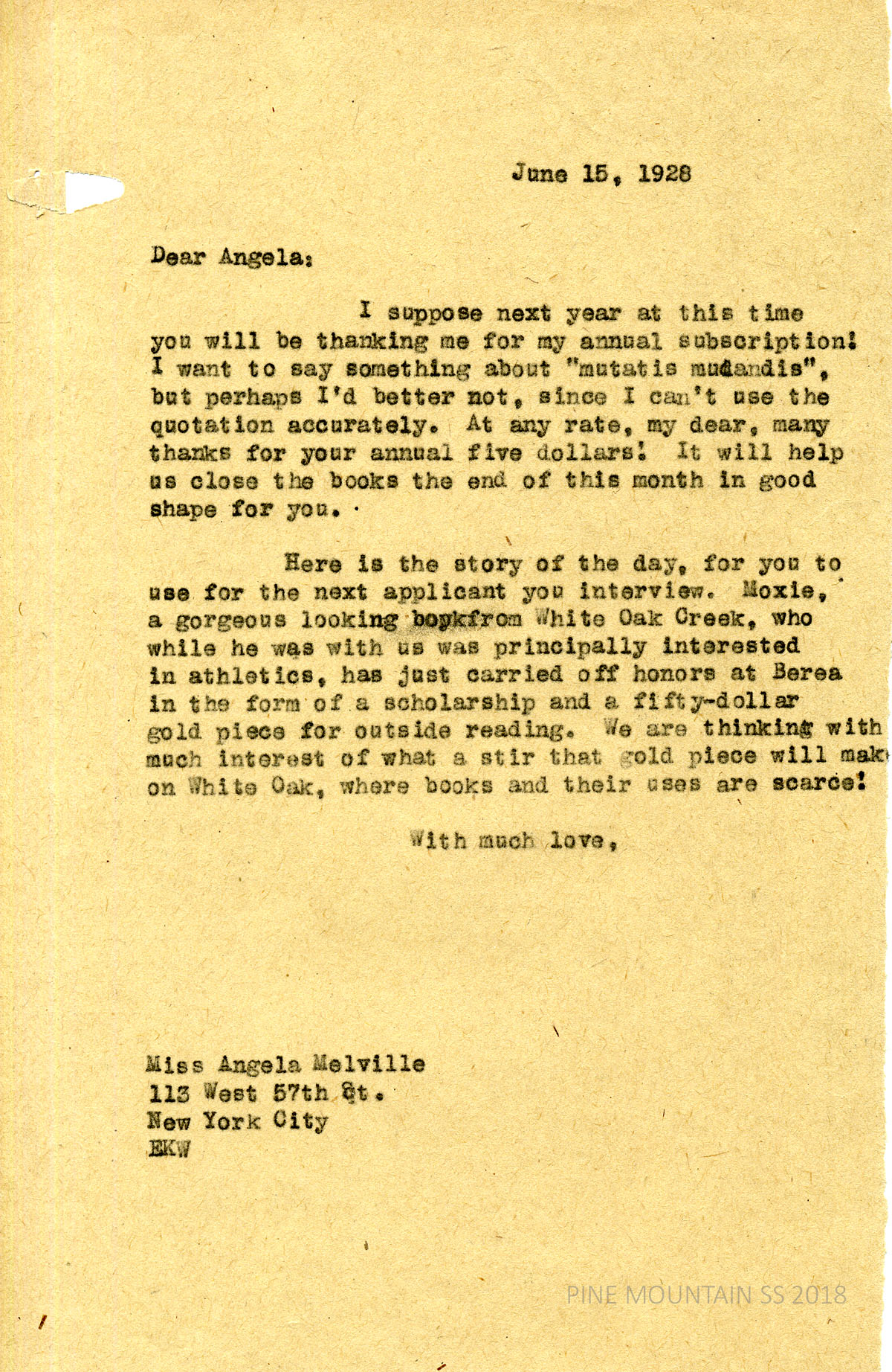 [melville_corr_035.jpg] Wells to Melville in NYC, June 15, 1928. Acknowledgement of Melville’s annual $5 contribution; story about Moxie’s success at Berea.
